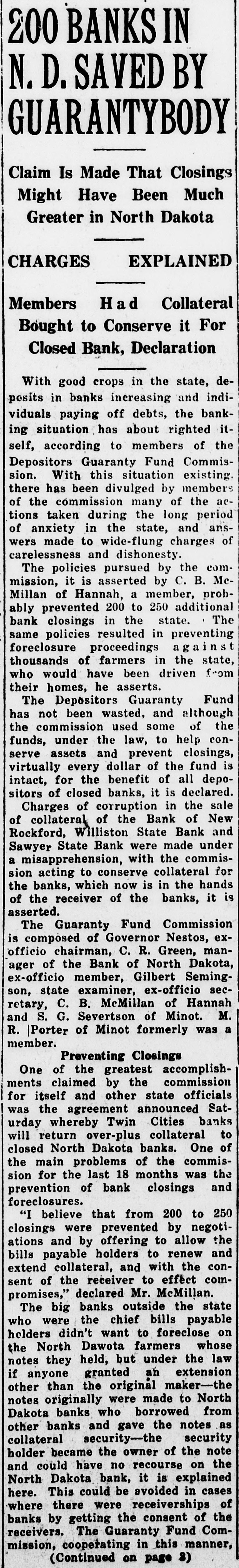 200 BANKS IN N. D. SAVED BY GUARANTYBODY Claim Is Made That Closings Might Have Been Much Greater in North Dakota EXPLAINED CHARGES Members Had Collateral Bought to Conserve it For Closed Bank, Declaration With good crops in the state, deposits in banks increasing and individuals paying off debts, the banking situation has about righted itself, according to members of the Depositors Guaranty Fund Commission. With this situation existing there has been divulged by members of the commission many of the actions taken during the long period of anxiety in the state, and answers made to wide-flung charges of carelessness and dishonesty. The policies pursued by the commission, it is asserted by C. B. McMillan of Hannah, a member, probably prevented 200 to 250 additional bank in same policies closings resulted the in state. preventing The foreclosure proceedings against thousands of farmers in the state, who would have been driven from their homes, he asserts. The Depositors Guaranty Fund has not been wasted, and although the commission used some of the funds, under the law, to help conserve assets and prevent closings, virtually every dollar of the fund is intact, for the benefit of all depositors of closed banks, it is declared. of of of the Charges collateral corruption Bank in Bank the of New sale and Rockford, Williston State Sawyer State Bank were made under a misapprehension, with the commisto conserve the which now sion banks, acting is collateral in the hands for of the receiver of the banks, it is asserted. The Guaranty Fund Commission is composed of Governor Nestos, exofficio chairman, C. R. Green, manof the ex-officio ager member, Bank of Gilbert North Seming- Dakota, son, state examiner, ex-officio secretary, C. B. McMillan of Hannah and S. G. Severtson of Minot. M. R. |Porter of Minot formerly was a member. Preventing Closings One of the greatest accomplishments claimed by the commission for itself and other state officials was the agreement announced Satwill urday return whereby over-plus Twin collateral Cities banks to closed North Dakota banks. One of the main problems of the commission for the last 18 months was the prevention of bank closings and foreclosures. that from 200 to 250 were closings "I believe prevented by negotiations and offering to allow the bills to renew payable by holders with the and extend collateral, and conthe receiver to comsent promises," of declared Mr. McMillan. effect banks the chief who The were big outside bills foreclose the payable state holders didn't want to on notes held, the North they Dawota but farmers under the whose law if the other anyone than granted original made an maker-the extension to North notes originally were Dakota banks who borrowed from other banks and gave the notes as collateral security-the security holder became the owner of the note and could have no recourse on the North Dakota bank, it is explained This could be avoided in cases were where here. there the receiverships consent of the of banks by getting receivers. The Guaranty Fund Commission, cooperating in this manner, (Continued on page 3)