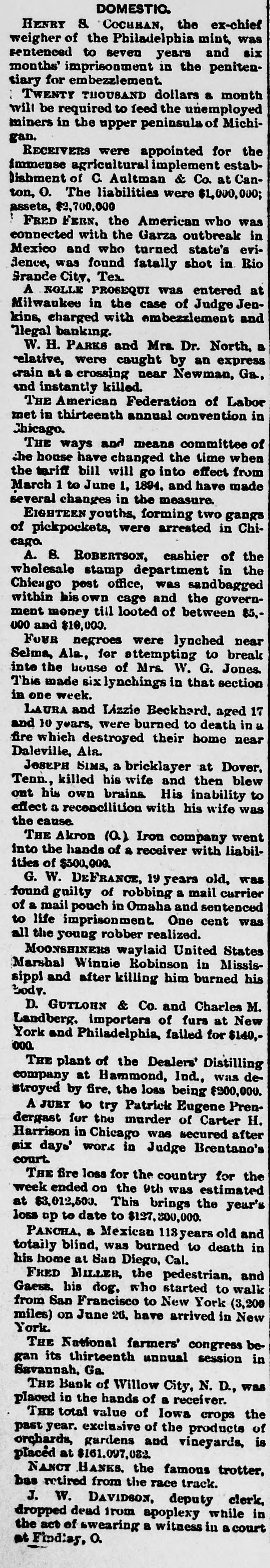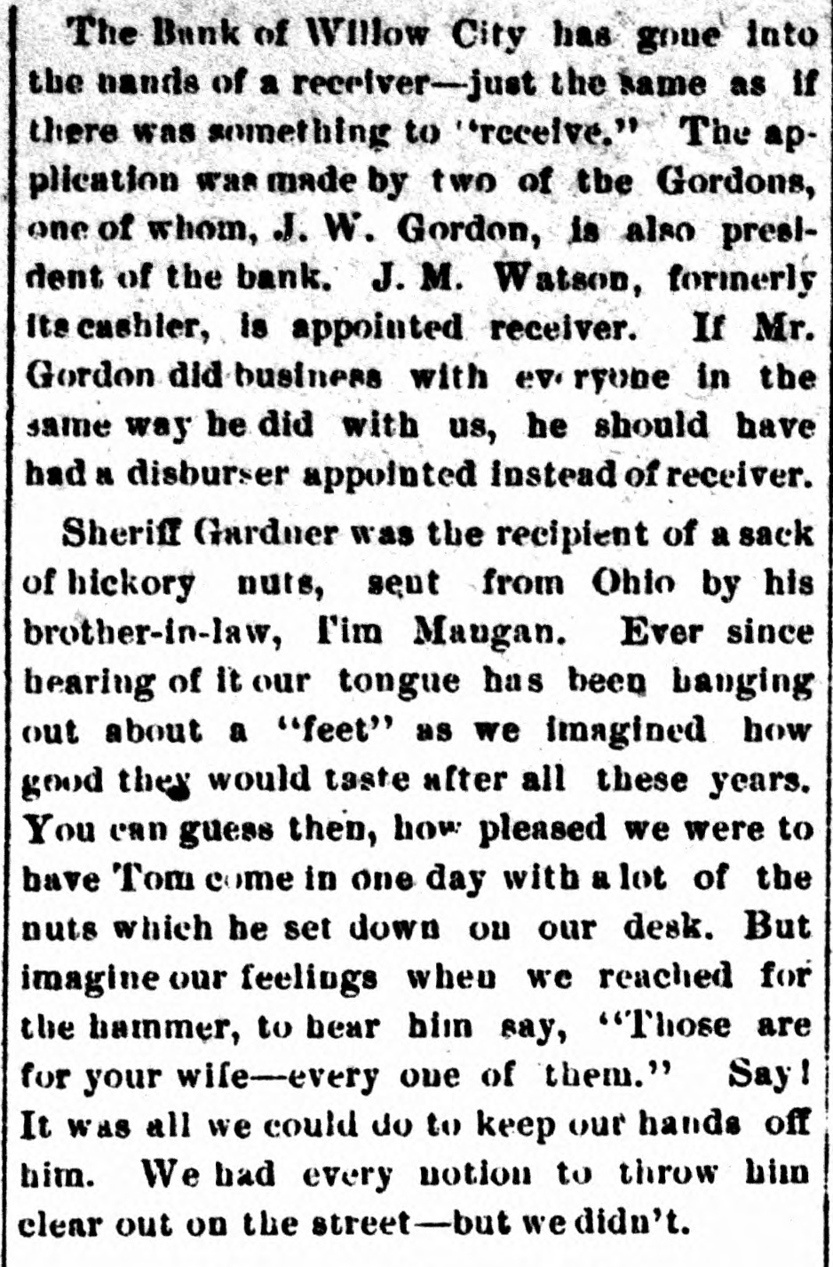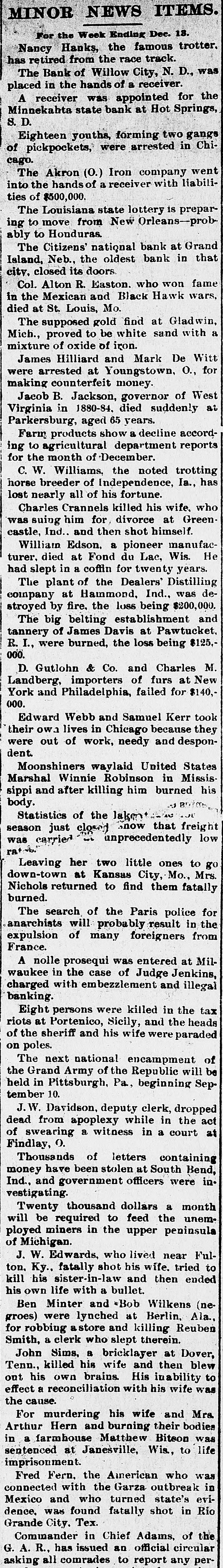 STATE NEWS. Items of Interest Gathered From All Parts of North Dakota. Pembina is talking of a ski club this winter. Grippe seems to have the whole state in itsgrip. Foster county is said to be over run with wolves. The Catholic fair at Grand Forks netted $1,500. There are now 320 patients in the state insane asylum. Mayville has organized a musical club called the "Mendelssohn." Grand Forks county get $4439.20, November school apportionment. Terence Martin has been appointed receiver of the Fargo land office. Owen and Bridget Kennedy of Mandan, have been granted original pensions. It is said John Vinson of Fargo, has fallen heir to a snug little fortune of $16,000. In Grand Forks district court Wm. Foley has been found guilty of highway robbery. Mr. and Mrs. Thomas Lofthouse of Fargo celebrated their golden wedding Saturday. Yerxa Hose company of Fargo had a big celebration of its Tenth anniversary Monday night. The Grand Forks News announces the state will move a re-hearing in the state depository case. Montana sheepmen lost eighty sheep out of a shipment at Jamestown, from the cold weather. A Stutsman county hired man threw cold water on hot lard, and will be laid up for some time. District court is on at Grand Forks with one of the largest calendars in the history of the state. C. H. Beach forged a $50 check over in Mandan. and is in jail to await the action of district court. A big flow of artesian water has been struck at a depth of 1,500 feet at Wimbledon, Stuteman county. Nick Karl of Neche was thrown from a wagon last week, and received injuries from which he died. Richland county had a smaller delinquent tax list this year than ever before, notwithstanding hard times. State University attaches are happy that their September bills have been audited by the state auditor. Rolla had a two weeks' term of court and only succeeded in convicting one man, who got off with a $15 fine. From present indications Foster county will lose $12,000 to $14,000 from the failure of the Carrington Bank. Judge Guptill of Fargo, has been appointed permanent receiver of the North Dakota Title and Insurance company. H. A. Foss, editor of Normanden, the former Independent organ, has been ousted, and the paper is now republican Conductor Reynolds fell under a train at Emerado, Wednesday night, and received injuries which may prove fatal. The Grand Forks Herald says the skies in railroad circles are becoming clouded and indications are ominous. J. M. Watson of Willow City, has been appointed receiver for the bank of Willow City. Creditors will be paid in full. A twenty-five tontine life policy for $5,000, paid for five years, was sold at sheriff's sale in Fargo the other day for $250. Fire at Willow City Friday destroyed several buildings, an he town had a narrow escape from a disastrous conflagration. Grand Forks charges farmers five cents a bucket, for water they use in watering their horses from the city troughs, Editor Wilson has sold the Minot Journal to H. E. Arnold and H. B. Mann, and will take charge of the Towner Independent. Major Richardson of Grand Forks, formerly territorial secretary, has left North Dakota, and will make his home in Missouri. It is said there is an insufficient fuel supply in the principal towns in the state, and in case of a snow blockade there may be trouble. The Minot Journal "has information" that the U. S. Marshalship will go to Walsh county, and Sheriff J. E. Cronan will be the lucky man. The asylum trustees think another ward building will be necessary before