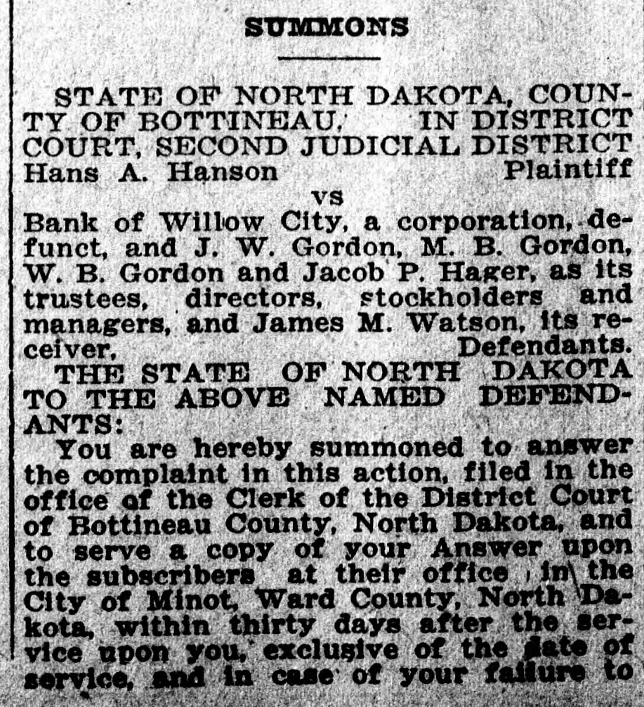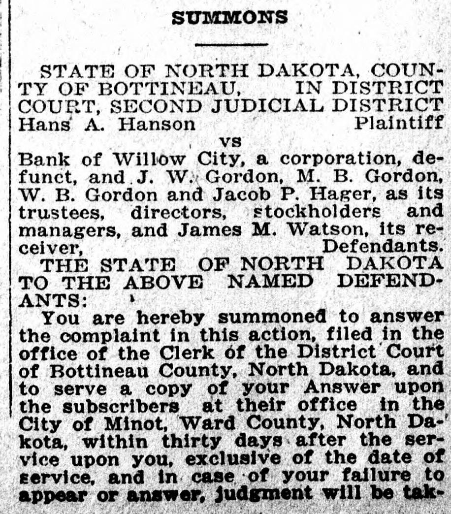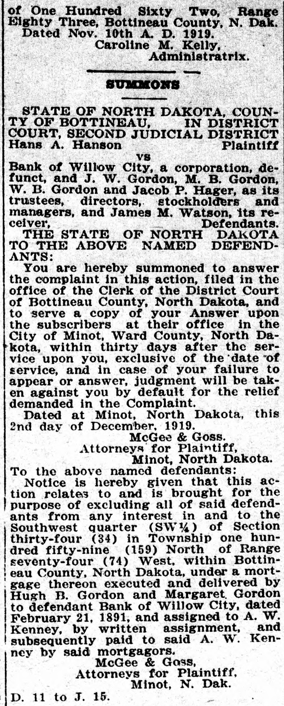 of One Hundred Sixty Two, Range Eighty Three, Bottineau County, N. Dak. Dated Nov. 10th A. D. 1919. Caroline M. Kelly, Administratrix. SUMMONS STATE OF NORTH DAKOTA, COUNTY OF BOTTINEAU, IN DISTRICT COURT, SECOND JUDICIAL DISTRICT Hans A. Hanson Plaintiff vs Bank of Willow City, a corporation, defunct, and J. W. Gordon, M. B. Gordon, W. B. Gordon and Jacob P. Hager, as its trustees, directors, stockholders and managers, and James M. Watson, its reDefendants. ceiver, THE STATE OF NORTH DAKOTA TO THE ABOVE NAMED DEFENDANTS: You are hereby summoned to answer the complaint in this action, filed in the office of the Clerk of the District Court of Bottineau County, North Dakota, and to serve a copy of your Answer upon the subscribers at their office in the City of Minot, Ward County, North Dakota, within thirty days after the service upon you, exclusive of the date "of service, and in case of your failure to appear or answer, judgment will be taken against you by default for the relief demanded in the Complaint. Dated at Minot, North Dakota, this 2nd day of December. 1919. McGee & Goss. Attorneys for Plaintiff, Minot, North Dakota. To the above named defendants: Notice is hereby given that this action relates to and is brought for the purpose of excluding all of said defendants from any interest in and to the Southwest quarter (SW) of Section thirty-four (34) in Township one hundred fifty-nine (159) North of Range seventy-four (74) West. within Bottineau County, North Dakota, under a mortgage thereon executed and delivered by Hugh B. Gordon and Margaret Gordon to defendant Bank of Willow City, dated February 21, 1891, and assigned to A. W. Kenney, by written assignment, and subsequently paid to said A. W. Kenney by said mortgagors. McGee & Goss, Attorneys for Plaintiff, Minot, N. Dak. D. 11 to J. 15.