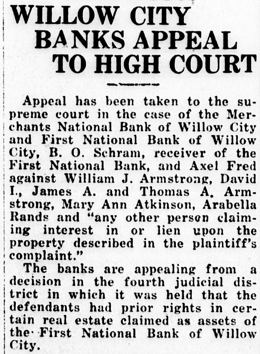 Appeal has been taken to the supreme court in the case of the Merchants National Bank of Willow City and First National Bank of Willow City, B. O. Schram, receiver of the First National Bank, and Axel Fred against William J. Armstrong, David I., James A. and Thomas A. Armstrong, Mary Ann Atkinson, Arabella Rands and "any other person claiming interest in or lien upon the property described in the plaintiff's complaint."