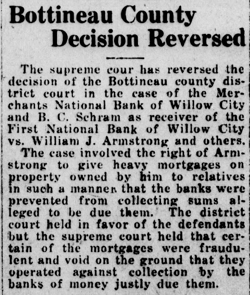 Bottineau County Decision Reversed --The supreme cour has reversed the decision of the Bottineau county district court in the case of the Merchants National Bank of Willow City and B. C. Schram as receiver of the First National Bank of Willow City vs. William J. Armstrong and others. The case involved the right of Armstrong to give heavy mortgages on property owned by him to relatives in such a manner that the banks were prevented from collecting sums alleged to be due them. The district court held in favor of the defendants but the supreme court held that certain of the mortgages were fraudulent and void on the ground that they operated against collection by the banks of money justly due them.