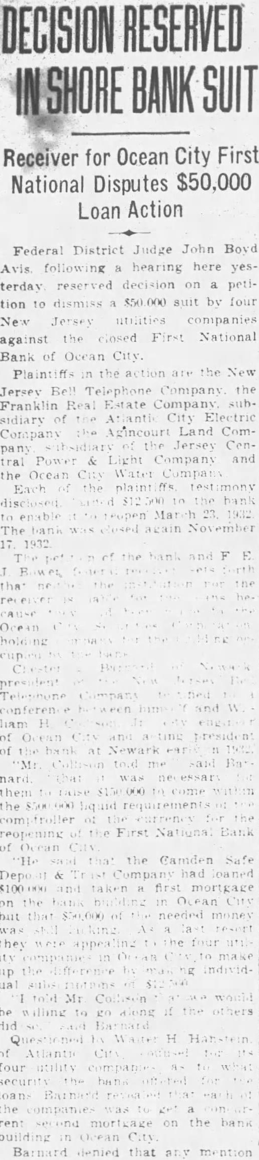 OCEAN reopening of OCEAN the First National bank in this city Millet has been delayed because the fed- may have eral bank examiner assigned to the the State task making the Ran- present som has been busy the Atlantic mayor having City bank according the county Edwards. board directors the closed institution. erning bank closed after sudden death Hiram Mowrer. president. week protective that he of the bank, Edwards bank by local residents tinue accept First National bank checks part request much quiet nervous depositbusiness people county the Ocean City National bank cutor has the cashier, George Groff. reports understood money been deposited than assigned has been withdrawn The selection Mr Mowrer's selected being considered directors. expected that when made concern- The ing opening name the tion of president will be made known.