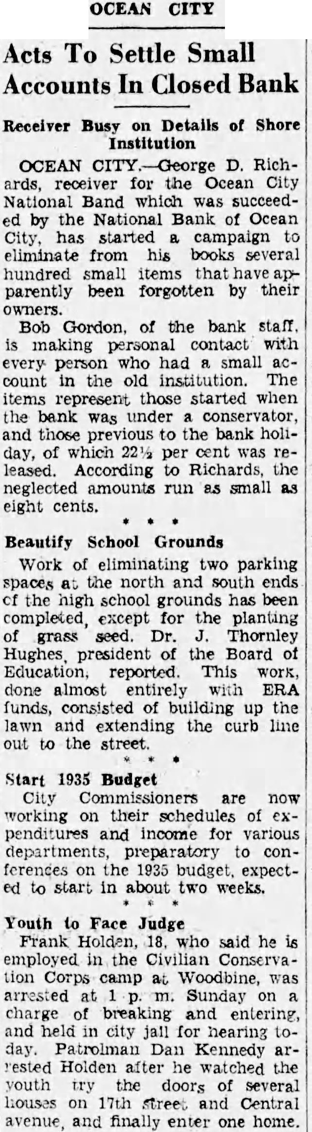 OCEAN CITY Acts To Settle Accounts In Closed Bank Receiver Busy Details of Shore Institution OCEAN Richards, for the Ocean Band succeedby National Bank of Ocean City, started campaign eliminate from his several hundred items parently been forgotten by their owners. Bob of the bank staff. making personal contact with had small person count institution. The items represent those started when the bank was under conservator, and those previous the bank day, which per leased. According Richards, the neglected amounts run as small eight cents. Beautify School Grounds Work eliminating two parking spaces north and south has been except for the planting grass seed. Dr. Thornley president the Board reported. work, done almost ERA funds, of up the the curb line the street. Start 1935 Budget City Commissioners are working their schedules of penditures income various departments, preparatory conferences budget. expected to start in about two weeks. Youth Face Judge Frank who said he Civilian tion Corps Woodbine, arrested Sunday charge breaking entering, and city for hearing day. Patrolman Kennedy rested Holden after the youth try the doors several houses street Central avenue, and finally enter one home.