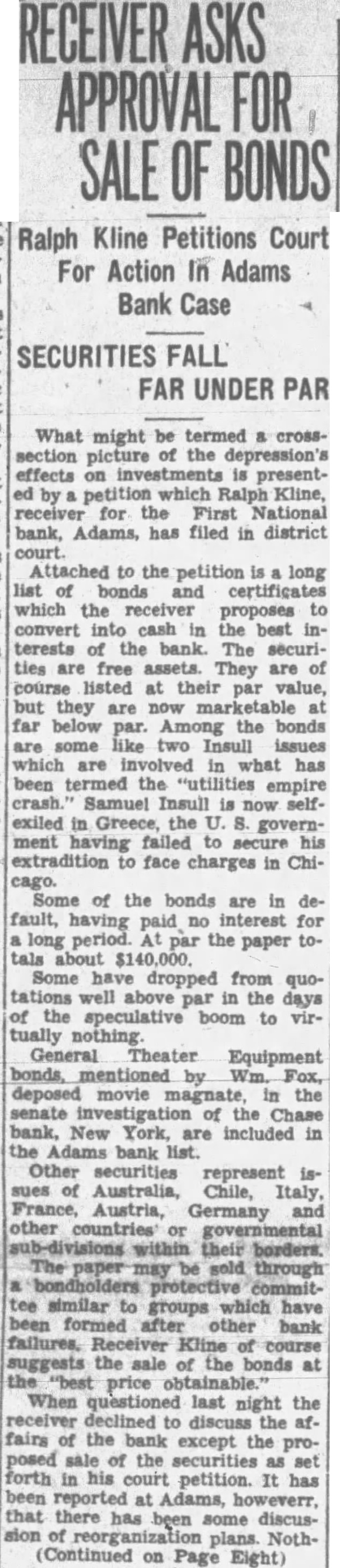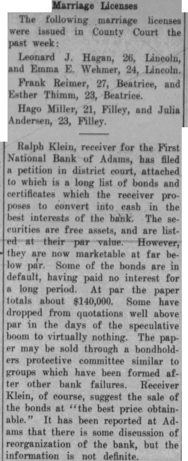 The farm known as the Burgess place, which of mile north and miles west of Filley, offered sheriff's sale at the Court House, Tuesday, to satisfy mortgage. The eighty acre farm brought $8,283, which was amount of the mortgage. averaglittle more than $100 an acre. The property was owned by the State Bank of Douglas, now defunct, and the mortgage held by Ada DunMrs. Dunlap was the winning bidder the sale.