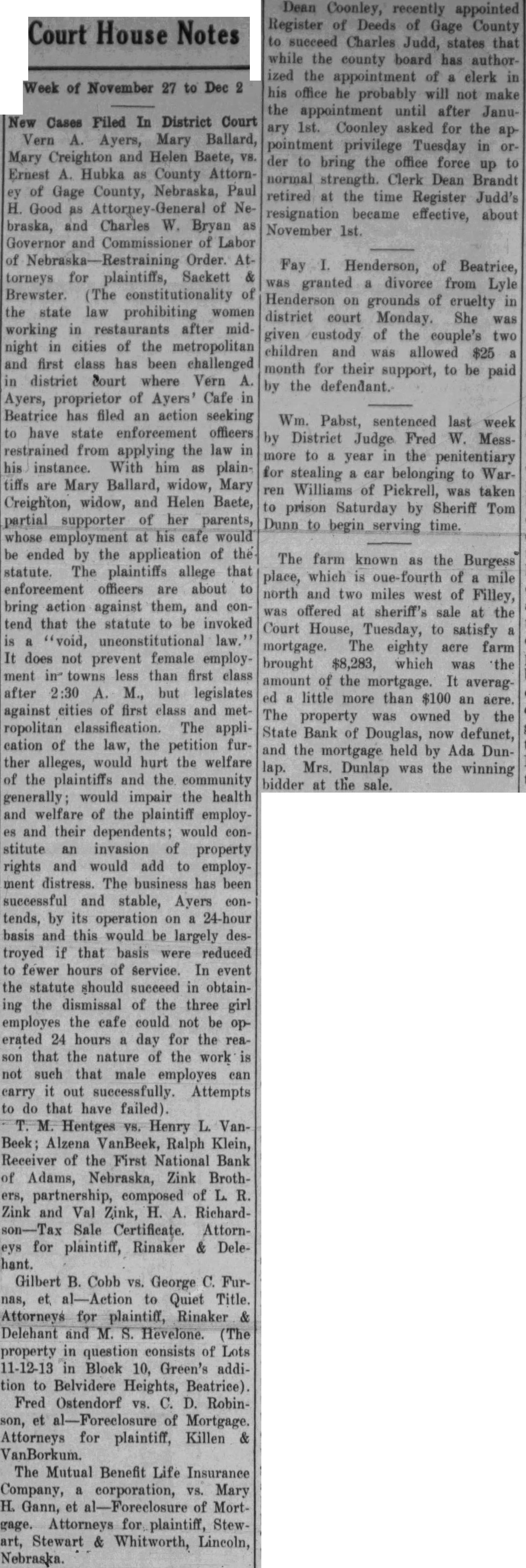 New Cases Filed In District Court Vern Ayers, Mary Ballard, Mary Creighton and Helen Baete, Ernest Hubka County of Gage County, Nebraska, Paul Good of Nebraska, and Charles Bryan Governor and Commissioner of Labor Order. Attorneys for plaintiffs, Sackett constitutionality of the state law prohibiting women working in restaurants after midnight in cities of the metropolitan and first class has been challenged district Court where Vern Ayers, proprietor of Ayers' Cafe Beatrice has filed an action seeking have state enforcement officers restrained from applying the law instance. With him as plaintiffs are Mary Ballard, widow, Mary Creighton, widow, and Helen Baete, partial supporter of her parents, employment at cafe would ended by the application of the statute. The plaintiffs allege that enforcement officers about to bring action against them, and contend that the statute to invoked uneonstitutional does not prevent female employ. ment towns less than first class after M., but legislates against of first class and ropolitan The cation of the law, the petition further alleges, would hurt the welfare of the plaintiffs and the community generally; would impair the health and welfare of the plaintiff employand their dependents; would constitute an invasion of property rights and would add to employment distress. The business has been successful and stable, Ayers contends, by its operation 24-hour basis and this would be largely destroyed if that basis were reduced to fewer hours of service. In event the statute should succeed in obtaining the dismissal of the three girl employes the cafe could not be erated 24 hours day for the that the nature of the work not such that male employes can carry out successfully. Attempts do that have failed). Hentges Henry VanBeek; Alzena VanBeek, Ralph Klein, Receiver of the First National Bank of Adams, Nebraska, Zink Brothpartnership, composed of Zink and Val Zink, RichardSale Certificate. Attornfor plaintiff, Rinaker Delehant. Gilbert Cobb George nas, to Quiet Title Attorneys for plaintiff, Rinaker Delehant and Hevelone. property in question consists of Lots Block 10, Green's addition to Belvidere Heights, Beatrice). Fred Ostendorf Robinof Mortgage. Attorneys for plaintiff, Killen VanBorkum. The Mutual Benefit Life Insurance Company, corporation, Mary Gann, et of Attorneys Stewart Whitworth, Lincoln, Nebraska.