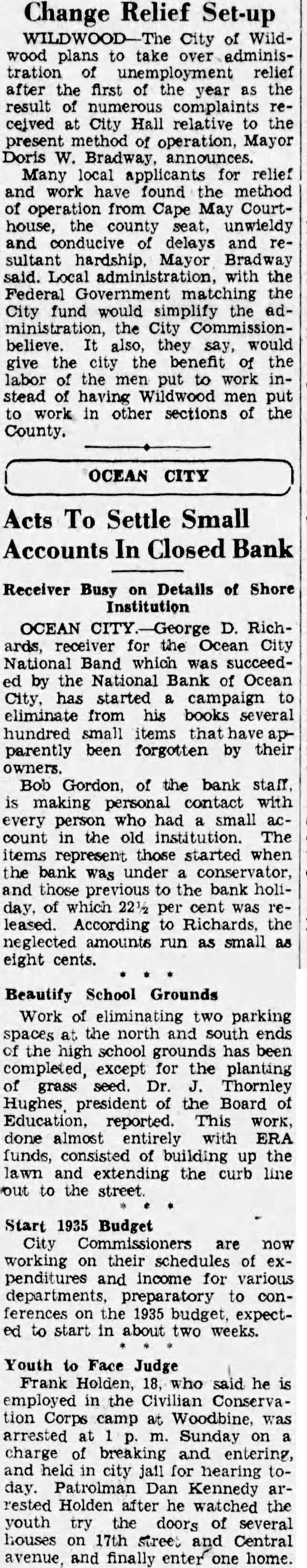 Change Set-up City of Wildwood plans to take administration unemployment relief after the first year the result complaints City relative present method operation, Mayor Doris Many for relief and work have found the method from Cape Courthouse, county seat, unwieldy conducive delays sultant hardship. Mayor the Federal fund would the ministration, the City Commissionbelieve. they would give the the benefit labor work stead having work in other sections of the County. OCEAN CITY Acts To Settle Small Accounts In Closed Bank Receiver on Details of Shore Institution OCEAN Richards, receiver Ocean National Band which was succeedby the National Bank Ocean City, started campaign eliminate from his books several hundred items parently been forgotten by their owners. Bob Gordon, of the bank staff. making personal contact with who small count The items represent those started when the bank under conservator, the bank holiwhich cent leased. According Richards, the neglected run as small eight cents. Beautify School Grounds Work of eliminating two parking spaces the north and south ends the school grounds has been completed, except for the planting grass Dr. Thornley president the Board reported. This done almost entirely ERA funds, consisted of building up the lawn extending the curb line to the street Start 1935 Budget City are now working their penditures and income for various preparatory conferences the 1935 expectto start in about two weeks. Youth Face Judge Frank Holden, said he Civilian tion Corps Woodbine, was arrested Sunday charge and city jail for hearing day. Dan Kennedy rested Holden after watched the youth the doors of several houses 17th and Central and finally enter one home.