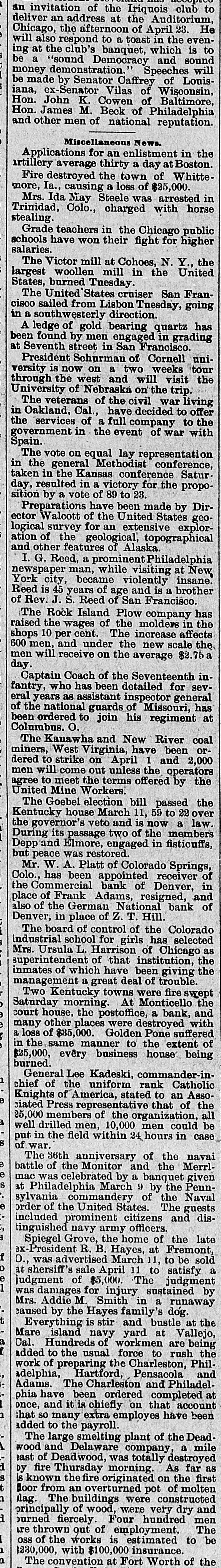 an invitation of the Iriquois club to an at the deliver address Auditorium, He Chicago, the afternoon of April 23. will also respond to a toast in the evening at the club's banquet, which is to be a "sound Democracy and sound money demonstration. Speeches will be made by Senator Caffrey of Louisiana, ex-Senator Vilas of Wisconsin, Hon John K. Cowen of Baltimore, Hon James M. Beck of Philadelphia and other men of national reputation. Miscellaneous News. Applications for an enlistment in the artillery average thirty a day at Boston. Fire destroyed the town of Whittemore, Ia. causing a loss of $25,000. Mrs. Ida May Steele was arrested in Trinidad, Colo., charged with horse stealing Grade teachers in the Chicago public schools have won their fight for higher salaries The Victor mill at Cohoes, N. Y. the largest woollen mill in the United States, burned Tuesday The United States cruiser San Francisco sailed from Lisbon Tuesday, going in a southwesterly direction. A ledge of gold bearing quartz has been found by men engaged in grading at Seventh street in San Francisco President Schurman of Cornell university is now on a two weeks tour through the west and will visit the University of Nebraska on the trip. The veterans of the civil war living in Oakland, Cal have decided to offer the services of a full company to the government in the event of war with Spain. The vote on equal lay representation in the general Methodist conference. taken in the Kansas conference Satur day, resulted in a victory for the proposition by a vote of 89 to 23. Preparations have been made by Director Walcott of the United States geological survey for an extensive exploration of the geological, topographical and other features of Alaska. I.G. Reed. a prominent Philadelphia newspaper man, while visiting at New York city, became violently insane. Reed is 45 years of age and is a brother of Rev. J.S. Reed of San Francisco. The Rock Island Plow company has raised the wages of the molders in the shops 10 per cent. The increase affects 600 men, and under the new scale the men will receive on the average $2.7b a day Captain Coach of the Seventeenth infantry, who has been detailed for several years as assistant inspector general of the national guards of Missouri, has been ordered to join his regiment at Columbus. O. The Kanawha and New River coal miners, West Virginia, have been or dered to strike on April 1 and 2,000 men will come out unless the operators agree to meet the terms offered by the United Mine Workers. The Goebel election bill passed the Kentucky house March 11, 59 to 22 over the governor's veto and is now a law During its passage two of the members Depp and Elmore, engaged in fisticuffs, but peace was restored. Mr. W. A. Platt of Colorado Springs, Colo. has been appointed receiver of the Commercial bank of Denver, in place of Frank Adams, resigned, and also of the German National bank of Denver, in place of Z. T. Hill. The board of control of the Colorado industrial school for girls has selected Mrs. Ursula L. Harrison of Chicago superintendent of that institution, the inmates of which have been giving the management a great deal of trouble Two Kentucky towns were fire swept Saturday morning. At Monticello the court house, the postoffice, a bank, and many other places were destroyed with a loss of $35,000 Golden Pone suffered in the same manner to the extent of $25,000, every business house being burned General Lee Kadeski, commander-inchief of the uniform rank Catholic Knights of America, stated to an Asso ciated Press representative that of the 25,000 members of the organization, all well drilled men, 10,000 men could be put in the field within 24 hours in case of war. The 36th anniversary of the navai battle of the Monitor and the Merrl mac was celebrated by a banquet given at Philadelphia March 9 by the Pennsylvania commandery of the Naval order of the United States The guests included prominent citizens and distinguished navy army officers. Spiegel Grove, the home of the late ex -President R. B. Hayes, at Fremont. D. was advertised March 11. to be sold at shersiff sale April 11 to satisfy a judgment of $5,000 The judgment was damages for injury sustained by Mrs. Addie M Smith in a runaway caused by the Hayes family' S dog Everything is stir and bustle at the Mare island navy yard at Vallejo, Cal. Hundreds of workmen are being added to the usual force to rush the work of preparing the Charleston, Philadelphia, Hartford, Pensacola and Adams. The Charleston and Philadel phia have been ordered completed at once, and it is chiefly on that account ;hat so many extra employes have been added to the payroll. The large smelting plant of the Deadwood and Delaware company, a mile east of Deadwood, was totally destroyed by fire Thursday morning As far as is known the fire originated on the first floor from an overturned pot of molten lag The buildings were constructed principally of wood, were very dry and burned fiercely Four hundred men ire thrown out of employment The OSS of the works is estimated to be $230,000, with $100,000 insurance. The convention at Fort Worth of the