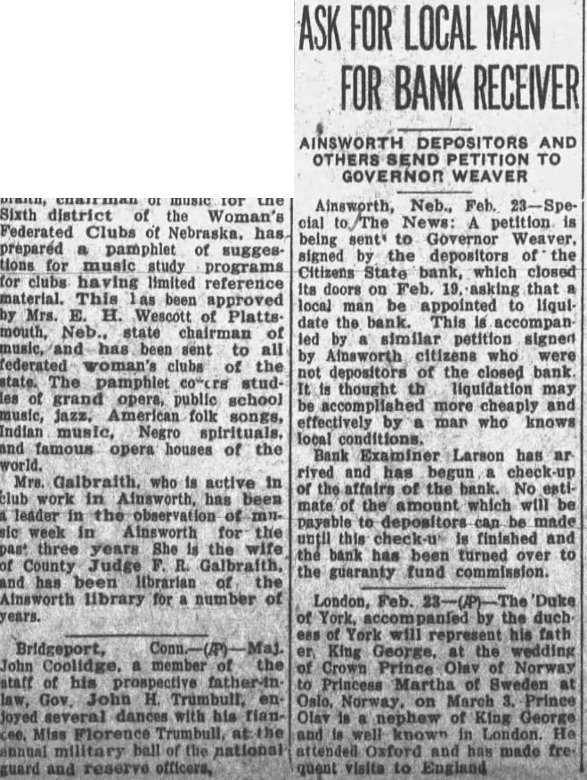 To the patrons and friends of The National Bank of Ainsworth: For over 42 years the National Bank of Ainsworth has stood shoulder to shoulder with the people of Ainsworth and Brown County, through prosperity and adversity alike. In its entire history it has never failed in a single obligation. There has never been a time that it had not the interests of the community at heart, nor has it ever lost sight of the absolute obligation that it owes to its depositors. In spite of its clean record for nearly half a century, there seems to have come a time when the confidenc of the public has been temporarily withheld. Every effort has been expended by the officers and stockholders to keep the bank in a sound financial condition, and their efforts have been so well rewarded that the past year has been the most prosperous one in the last decade. The misfortune that occurred last week in the closing of the Citizens Bank seems to have caused a feeling of unrest and lack of confidence in the minds of the people and resulted in very heavy withdrawals of de-s posits from the National Bank on Saturday of last week and Monday and Tuesday of this week. At no time was there anything resembling a "run" on the bank, but the withdrawals were steady and persistent. Yet the resources of the bank were not endangered. However, there was no indication that the demands of our depositors would cease before the danger point would be reached, and it was decided by our Directors that in justice to our depositors, the withdrawal should not be permitted to continue and that the bank should be closed while it was yet solvent and capable of liquidating all demands. Hence, the doors have been closed and the bank has been placed in the hands of the Comptroller of the Currency. While the officers regret that it seemed necessary to suspend operations, still they are convinced that such action was the proper course to pursue in order that our depositors might be fully potected. It might be well to state that prior to Tuesday of last week the bank owed nothing for borrowed money and had no re-discounted paper. However, owing to the closing of the Citizens Bank on Tuesday, it was considered advisable to obtain a loan to enable us to cope with any reasonable emergency and we therefore borrowed $29,500 on our bills payable. That loan has not been increased ,nor has any part of the borrowed money been expended. In other words, we still have the $29,500 in cash or its equivalent, and a considerable amount besides. The loan may therefore be fully discharged without exhausting our available cash, and thus when our bills payable are liquidated out of the funds which we now have on hand, we will be free from debt for borrowed money, and all of our assets will be available for the payment of our depositors. We consider that our notes and other assets are worth practically 100 cents on the dollar, and we believe that our depositors have no cause to worry. We know that we have been the victim of unfounded rumors, which have been circulated partly through ignorance and partly through unfriendly motives. Still, we are not placing the blame on anyone. We appreciate the great confidence that has at all times been placed in this bank, and feel sure that future developments will justify that confidence.