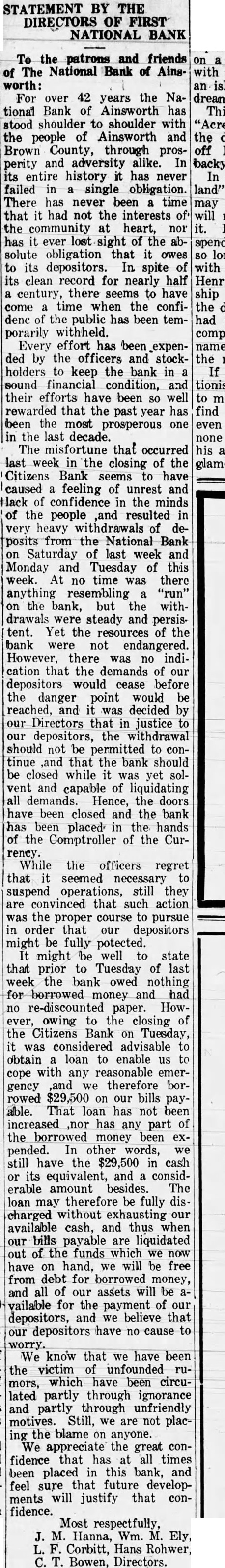 STATEMENT BY THE DIRECTORS OF FIRST NATIONAL BANK To the patrons and friends of The National Bank of Ainsworth: For over 42 years the National Bank of Ainsworth has stood shoulder to shoulder with the people of Ainsworth and Brown County, through prosperity and adversity alike. In its entire history it has never failed in a single obligation. There has never been a time that it had not the interests of the community at heart, nor has it ever lost sight of the absolute obligation that it owes to its depositors. In spite of its clean record for nearly half a century, there seems to have come a time when the confidenc of the public has been temporarily withheld. Every effort has been expended by the officers and stockholders to keep the bank in a sound financial condition, and their efforts have been so well rewarded that the past year has been the most prosperous one in the last decade. The misfortune that occurred last week in the closing of the Citizens Bank seems to have caused a feeling of unrest and lack of confidence in the minds of the people and resulted in very heavy withdrawals of de-s posits from the National Bank on Saturday of last week and Monday and Tuesday of this week. At no time was there anything resembling a "run" on the bank, but the withdrawals were steady and persistent. Yet the resources of the bank were not endangered. However, there was no indication that the demands of our depositors would cease before the danger point would be reached, and it was decided by our Directors that in justice to our depositors, the withdrawal should not be permitted to continue and that the bank should be closed while it was yet solvent and capable of liquidating all demands. Hence, the doors have been closed and the bank has been placed in the hands of the Comptroller of the Currency. While the officers regret that it seemed necessary to suspend operations, still they are convinced that such action was the proper course to pursue in order that our depositors might be fully potected. It might be well to state that prior to Tuesday of last week the bank owed nothing for borrowed money and had no re-discounted paper. However, owing to the closing of the Citizens Bank on Tuesday, it was considered advisable to obtain a loan to enable us to cope with any reasonable emergency and we therefore borrowed $29,500 on our bills payable. That loan has not been increased ,nor has any part of the borrowed money been expended. In other words, we still have the $29,500 in cash or its equivalent, and a considerable amount besides. The loan may therefore be fully discharged without exhausting our available cash, and thus when our bills payable are liquidated out of the funds which we now have on hand, we will be free from debt for borrowed money, and all of our assets will be available for the payment of our depositors. We consider that our notes and other assets are worth practically 100 cents on the dollar, and we believe that our depositors have no cause to worry. We know that we have been the victim of unfounded rumors, which have been circulated partly through ignorance and partly through unfriendly motives. Still, we are not placing the blame on anyone. We appreciate the great confidence that has at all times been placed in this bank, and feel sure that future developments will justify that confidence. Most respectfully, J. M. Hanna, Wm. M. Ely, L. F. Corbitt, Hans Rohwer, C. T. Bowen, Directors.