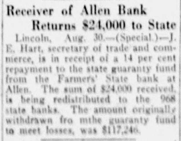 Receiver of Allen Bank Returns $24,000 to State Lincoln, Aug. 30 E. Hart, secretary of trade and commerce, is in receipt of a 14 per cent repayment to the state guaranty fund from the Farmer's State bank at Allen. The sum of $24,000 received. is being redistributed to the 968 state banks. The amount originally withdrawn fro mthe guaranty fund to meet losses, was $117,246.