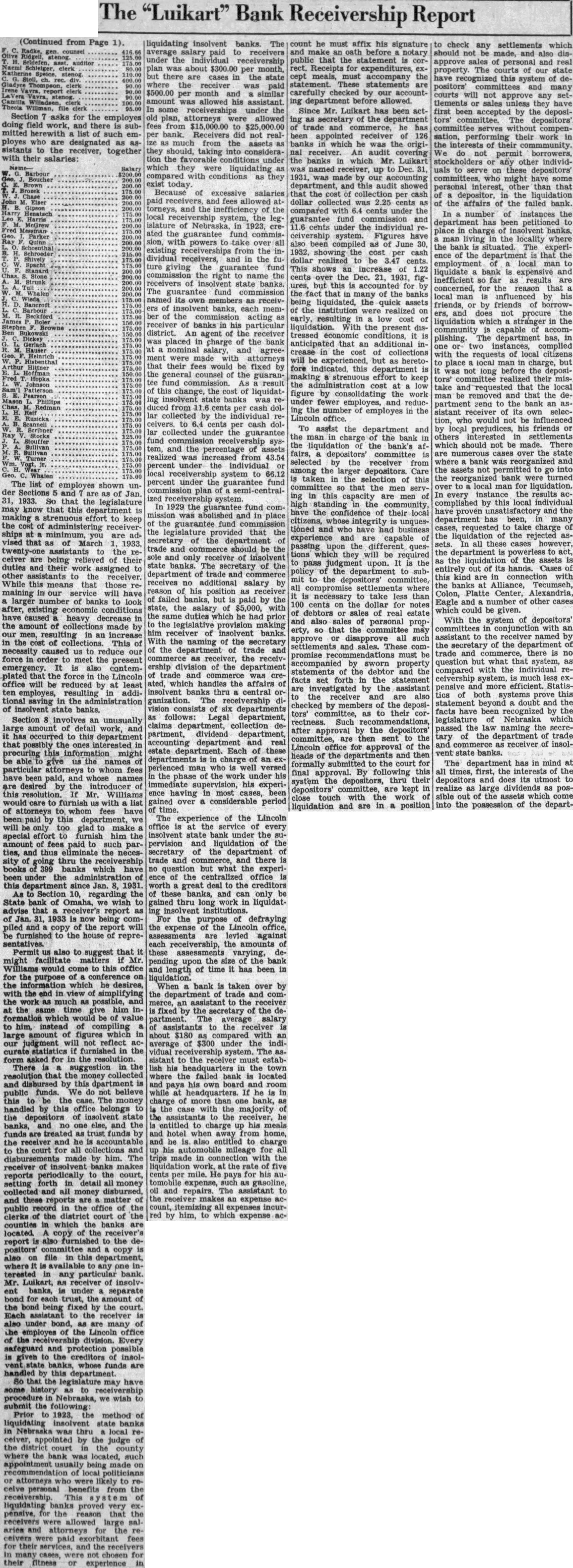 The "Luikart" Bank Receivership Report (Continued from Page 1). clerk Section asks for the employes doing field work, and there is submitted herewith of such employes who are designated sistants receiver, together their salaries: The list of employes shown under Sections and are as Jan. 31, 1933. So that the legislature may know that this department is making strenuous effort to keep the cost of administering receiverships minimum, you adare vised as of March 1933, assistants the receiver are being relieved of their duties their work assigned to other to the receiver. While this means that those remaining in our will have larger number of banks to look after, existing conditions caused heavy decrease in the amount of collections made by men, an increase the cost of This of necessity us to reduce our force order to meet the present emergency. is also contemplated that the force in the Lincoln office will be reduced by at least ten employes, resulting additional saving in the administration of insolvent state banks. Section 8 involves an unusually large amount of detail work, has occurred to this department that possibly the ones interested procuring this information might able give us the names of particular attorneys to whom fees have been paid, whose names are desired by the introducer of this resolution. If Mr. Williams would care to furnish with list of attorneys to whom fees have this we will only too glad to special effort to him the amount of fees paid to such parties, and thus the necessity of going thru the receivership books banks which have been under the administration this department since Jan. 1931. Section 10, regarding the State bank of Omaha, wish to advise that receiver's report of Jan. 31, 1933 now being compiled and copy of the report will furnished to the house of representatives. Permit us also to suggest that it might facilitate matters Mr. would come to this office for the purpose on the which he desires, with the end in view simplifying the as possible, at the time give him information which be of value to him, instead of large amount of figures which in our judgment will not reflect curate if furnished in the form asked for in the resolution. There is suggestion in the that the money collected and disbursed by this dpartment is public funds. We do not believe this to be the case. The money handled by this office belongs to the depositors of insolvent state banks, and no one else, and the funds are treated trust funds by the receiver and he is accountable to the court for all and made by him. The receiver of insolvent reports periodically the court, setting forth in detail all money collected and all money disbursed, and these are matter public in the office of the clerks the district court of the counties in which the banks are located copy of the receiver's report is also to the depositors' and copy is also on file this department, where is available to any one interested in any particular bank. Mr. Luikart, as receiver of insolvent banks, under separate bond for each trust, the amount of the bond being fixed by the Each assistant to the receiver also under bond, as are many the of the Lincoln office the division. Every safeguard and possible to the creditors of insolwhose funds are handled by this So that the may have some history as to procedure in Nebraska, we wish to submit the Prior the method of liquidating insolvent state banks in Nebraska thru local receiver, appointed by the judge the district court the county where the bank was located, such appointment usually being made on of local politicians attorneys who were likely to recelve personal benefits from the receivership. This liquidating banks proved very expensive, for the that the allowed large salaries and attorneys for the receivers paid fees for and the cases, not chosen for their fitness or experience liquidating insolvent banks. The average paid to receivers under the receivership plan was about per month, but there are cases in the state where the receiver was $500.00 per month and similar amount was allowed his assistant. In some receiverships under the old plan, attorneys were allowed fees from to bank. Receivers did not realmuch from the assets they should, taking into consideration the under which were liquidating as they exist today Because of excessive salaries paid and fees and the of the local system, the leg. islature of Nebraska, in 1923, ated the fund sion, with powers take over existing from the dividual receivers, the ture giving guarantee commission the right to name the receivers of insolvent state banks. The guarantee fund commission named its members as receivof insolvent banks, member the commission acting receiver banks in his particular district. An agent the receiver was placed in charge of the bank that their fees fixed by the counsel of the guarantee fund As result this change, the liquidatinsolvent state banks was duced from cents cash dollar collected by the individual ceivers. to 6.4 cents per cash dollar collected under the guarantee fund system, and the percentage of assets realized was increased from percent under the individual local receivership system to percent under the guarantee commission plan semi-centralized system. In 1929 the guarantee fund comabolished and in place of the guarantee fund the legislature that the of the trade should be the sole and only of state banks. The of the department of trade and receives additional salary by reason his position as failed but paid by the state, the salary $5,000, with the same duties which he had prior the legislative provision making him insolvent banks With the naming of the secretary of the department trade receiver, the receivership division of the department of trade commerce was created, which handles the affairs of insolvent banks thru central organization. receivership vision consists six departments as follows: Legal department, claims department, collection department, dividend department, accounting depa