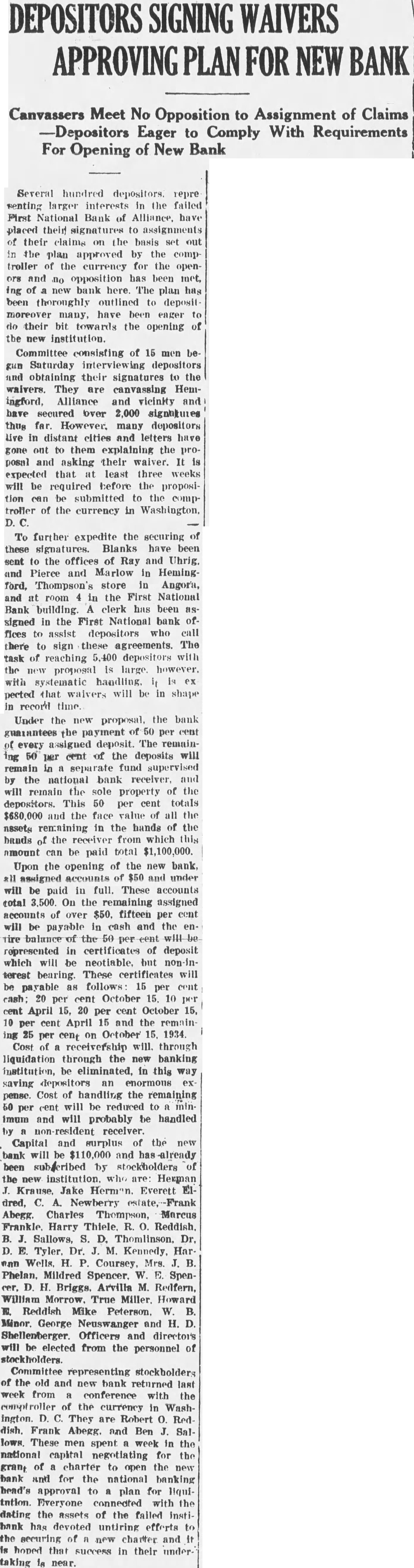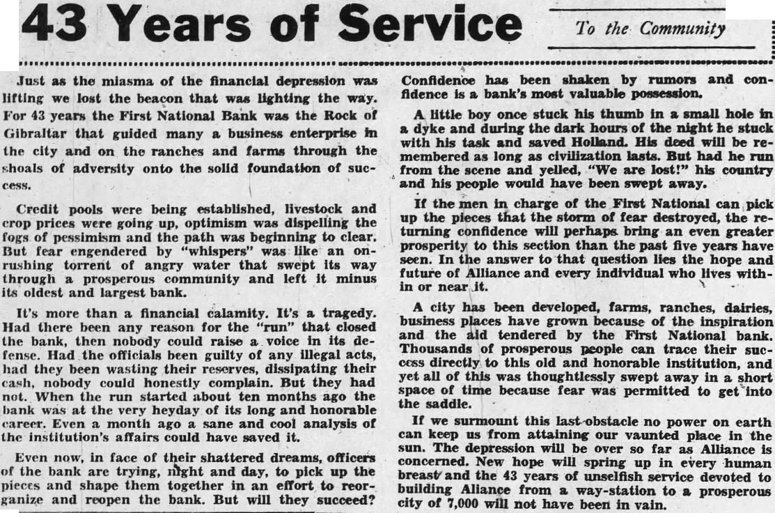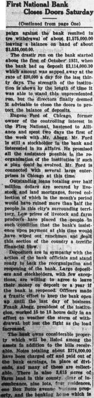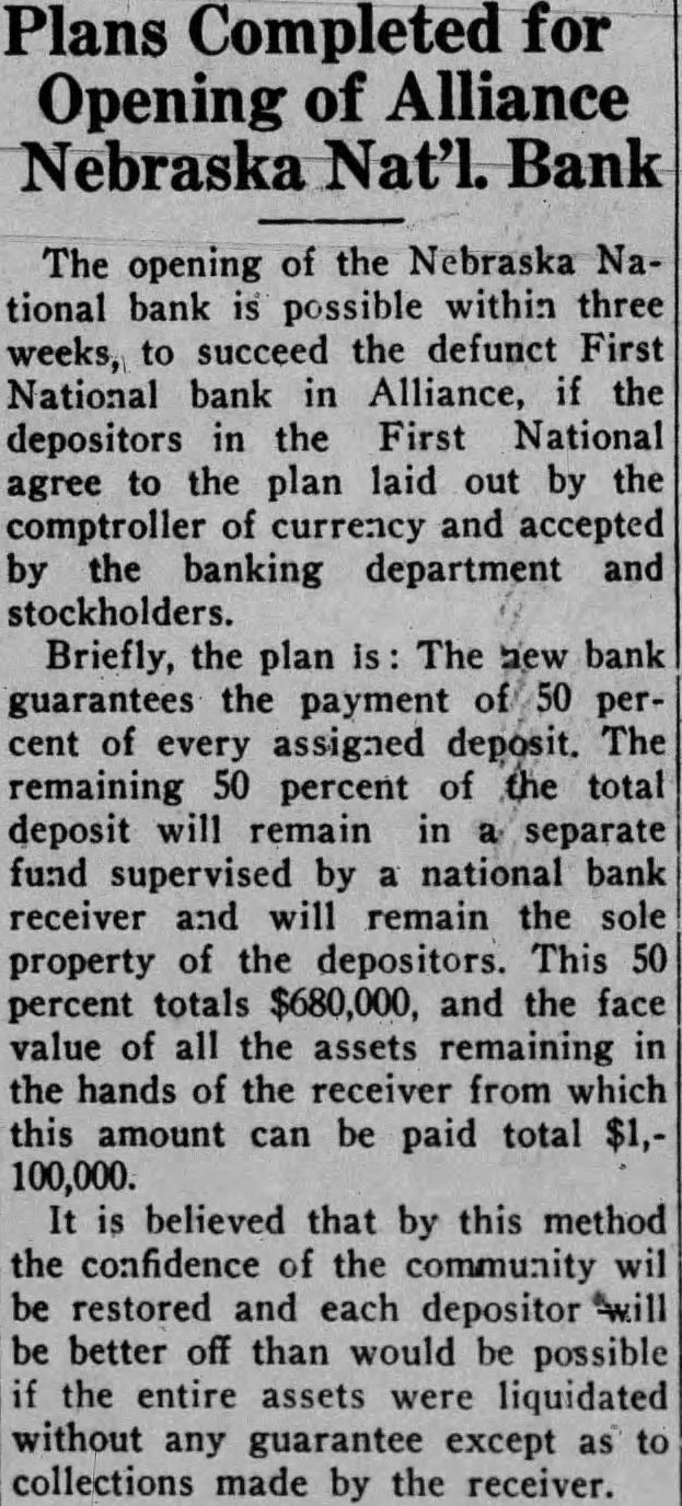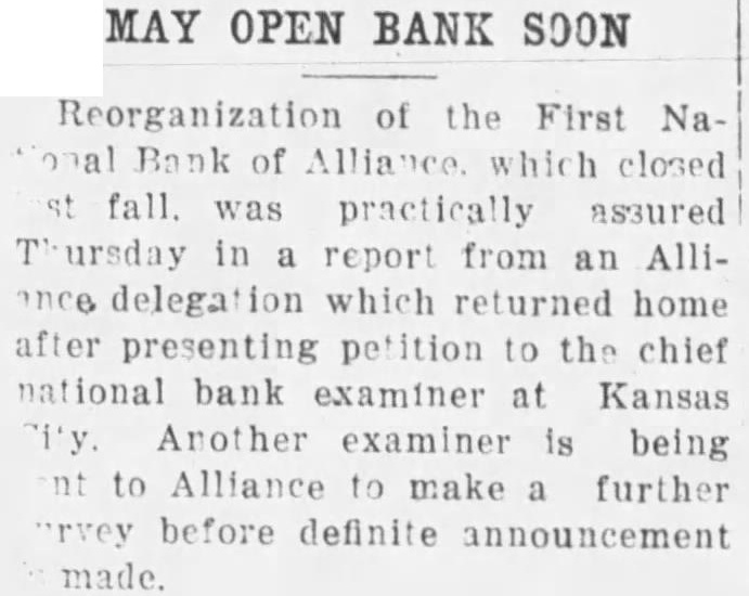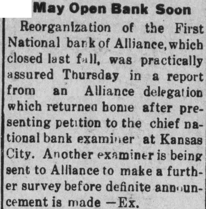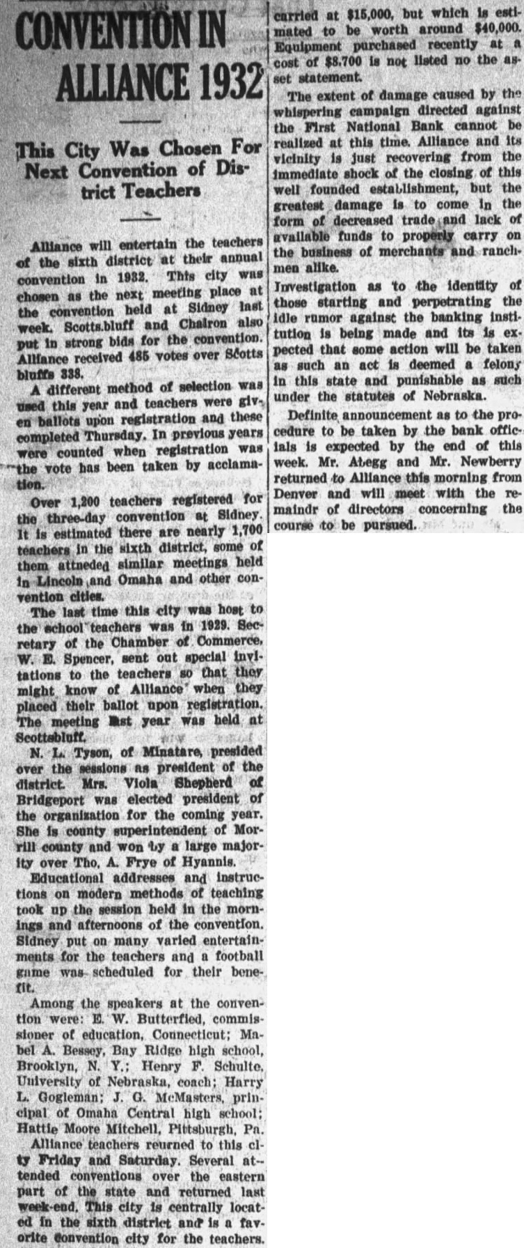 CONVENTION IN ALLIANCE 1932 This City Was Chosen For Next Convention of District Teachers Alliance will entertain the teachers of the sixth district at their annual convention in 1932. This city was chosen as the next meeting place at the convention held at Sidney last week. Scotts.bluff and Chairon also put in strong bids for the convention. Alliance received 485 votes over Scotts bluffs 338. A different method of selection was used this year and teachers were given ballots upon registration and these completed Thursday. In previous years were counted when registration was the vote has been taken by acclamation. Over 1,200 teachers registered for the three-day convention at Sidney It is estimated there are nearly 1,700 teachers in the sixth district, some of them attneded similar meetings held in Lincoln and Omaha and other convention cities. The last time this city was host to the school teachers was in 1929. Secretary of the Chamber of Commerce. W. E. Spencer, sent out special invitations to the teachers so that they might know of Alliance when they placed their ballot upon registration. The meeting last year was held at Scottsbluff. N. L. Tyson, of Minatare, presided over the sessions as president of the district. Mrs. Viola Shepherd of Bridgeport was elected president of the organization for the coming year. She is county superintendent of Morrill county and won by a large majority over Tho. A. Frye of Hyannis. Educational addresses and instructions on modern methods of teaching took up the session held in the mornings and afternoons of the convention. Sidney put on many varied entertainments for the teachers and a football game was scheduled for their benefit. Among the speakers at the convention were: E. W. Butterfied, commissioner of education, Connecticut: Mabel A. Bessey, Bay Ridge high school, Brooklyn, N. Y.: Henry F. Schulte. University of Nebraska, coach; Harry L. Gogleman: J. G. McMasters, principal of Omaha Central high school: Hattle Moore Mitchell, Pittsburgh, Pa. Alliance teachers reurned to this cl ty Friday and Saturday. Several at-tended conventions over the eastern part of the state and returned last week-end. This city is centrally located in the sixth district and is a favorite Convention city for the teachers. carried at $15,000, but which is estimated to be worth around $40,000. Equipment purchased recently at a cost of $8.700 is not listed no the asset statement. The extent of damage caused by the whispering campaign directed against the First National Bank cannot be realized at this time. Alliance and its vicinity is just recovering from the immediate shock of the closing of this well founded establishment, but the greatest damage is to come In the form of decreased trade and lack of available funds to properly carry on the business of merchants and ranchmen alike. Investigation as 'to the identity of those starting and perpetrating the idle rumor against the banking institution is being made and its is expected that some action will be taken as such an act is deemed a felony in this state and punishable as such under the statutes of Nebraska. Definite announcement as to the procedure to be taken by the bank officials is expected by the end of this week. Mr. Ategg and Mr. Newberry returned to Alliance this morning from Denver and will meet with the remaindr of directors concerning the course to be pursued.