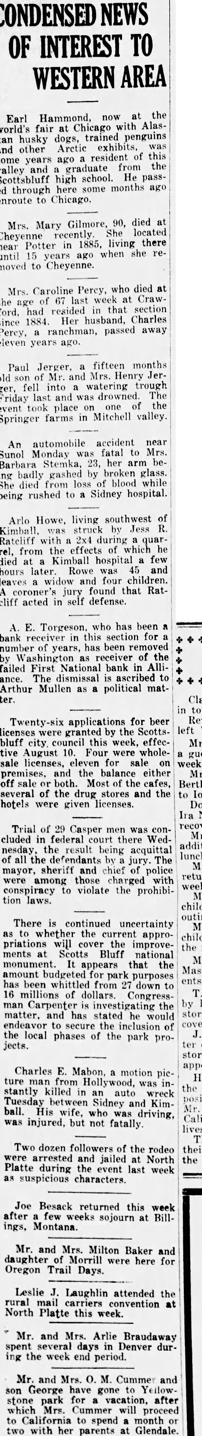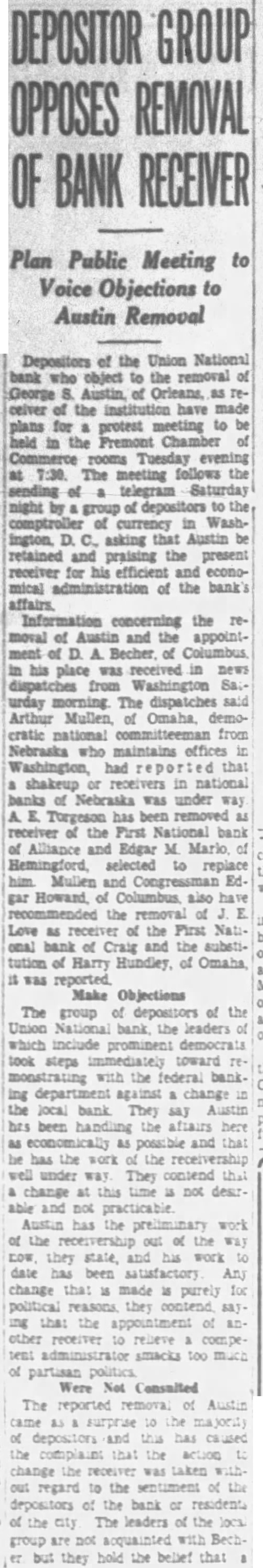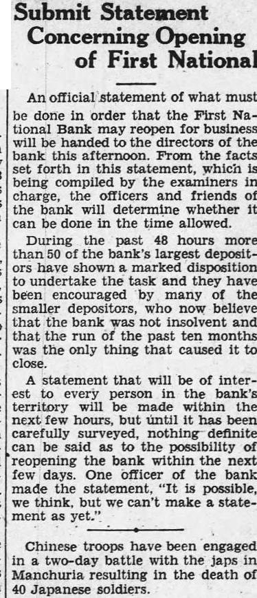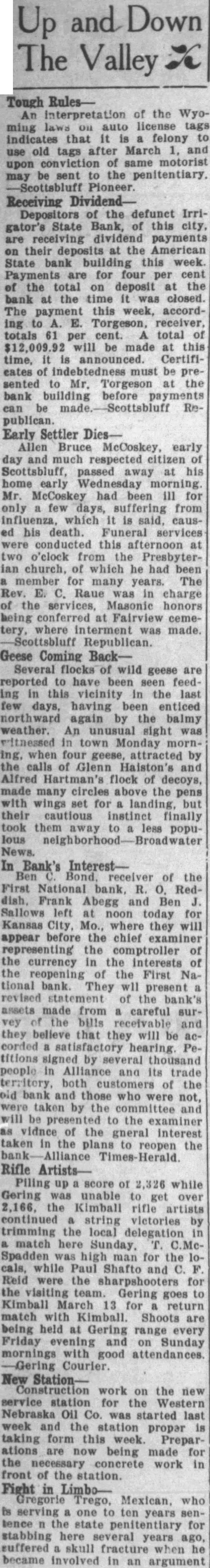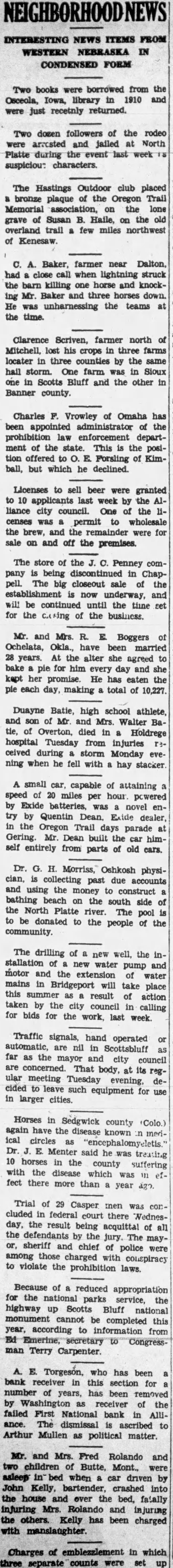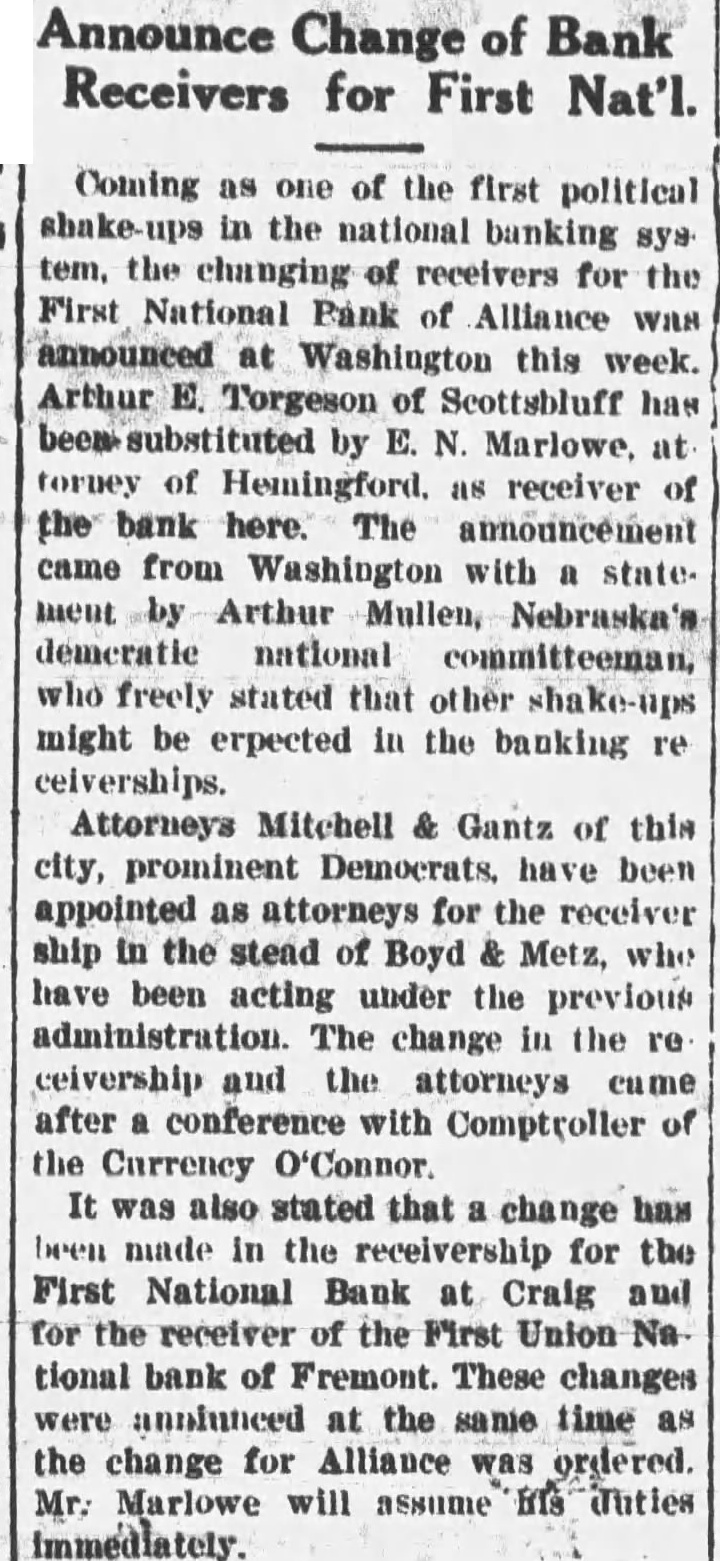 CONVENTION IN ALLIANCE 1932 This City Was Chosen For Next Convention of District Teachers Alliance will entertain the teachers of the sixth district at their annual convention in 1932. This city was chosen as the next meeting place at the convention held at Sidney last week. Scotts.bluff and Chairon also put in strong bids for the convention. Alliance received 485 votes over Scotts bluffs 338. A different method of selection was used this year and teachers were given ballots upon registration and these completed Thursday. In previous years were counted when registration was the vote has been taken by acclamation. Over 1,200 teachers registered for the three-day convention at Sidney It is estimated there are nearly 1,700 teachers in the sixth district, some of them attneded similar meetings held in Lincoln and Omaha and other convention cities. The last time this city was host to the school teachers was in 1929. Secretary of the Chamber of Commerce. W. E. Spencer, sent out special invitations to the teachers so that they might know of Alliance when they placed their ballot upon registration. The meeting last year was held at Scottsbluff. N. L. Tyson, of Minatare, presided over the sessions as president of the district. Mrs. Viola Shepherd of Bridgeport was elected president of the organization for the coming year. She is county superintendent of Morrill county and won by a large majority over Tho. A. Frye of Hyannis. Educational addresses and instructions on modern methods of teaching took up the session held in the mornings and afternoons of the convention. Sidney put on many varied entertainments for the teachers and a football game was scheduled for their benefit. Among the speakers at the convention were: E. W. Butterfied, commissioner of education, Connecticut: Mabel A. Bessey, Bay Ridge high school, Brooklyn, N. Y.: Henry F. Schulte. University of Nebraska, coach; Harry L. Gogleman: J. G. McMasters, principal of Omaha Central high school: Hattle Moore Mitchell, Pittsburgh, Pa. Alliance teachers reurned to this cl ty Friday and Saturday. Several at-tended conventions over the eastern part of the state and returned last week-end. This city is centrally located in the sixth district and is a favorite Convention city for the teachers. carried at $15,000, but which is estimated to be worth around $40,000. Equipment purchased recently at a cost of $8.700 is not listed no the asset statement. The extent of damage caused by the whispering campaign directed against the First National Bank cannot be realized at this time. Alliance and its vicinity is just recovering from the immediate shock of the closing of this well founded establishment, but the greatest damage is to come In the form of decreased trade and lack of available funds to properly carry on the business of merchants and ranchmen alike. Investigation as 'to the identity of those starting and perpetrating the idle rumor against the banking institution is being made and its is expected that some action will be taken as such an act is deemed a felony in this state and punishable as such under the statutes of Nebraska. Definite announcement as to the procedure to be taken by the bank officials is expected by the end of this week. Mr. Ategg and Mr. Newberry returned to Alliance this morning from Denver and will meet with the remaindr of directors concerning the course to be pursued.