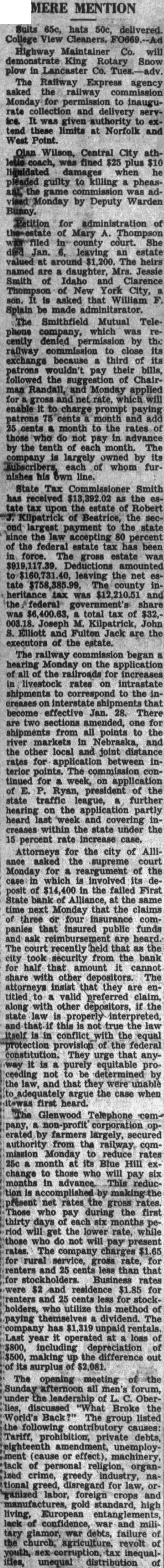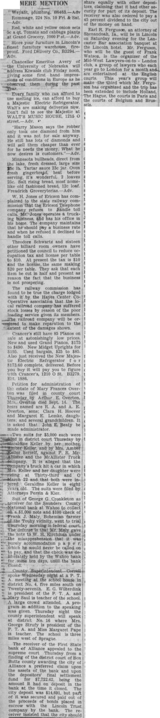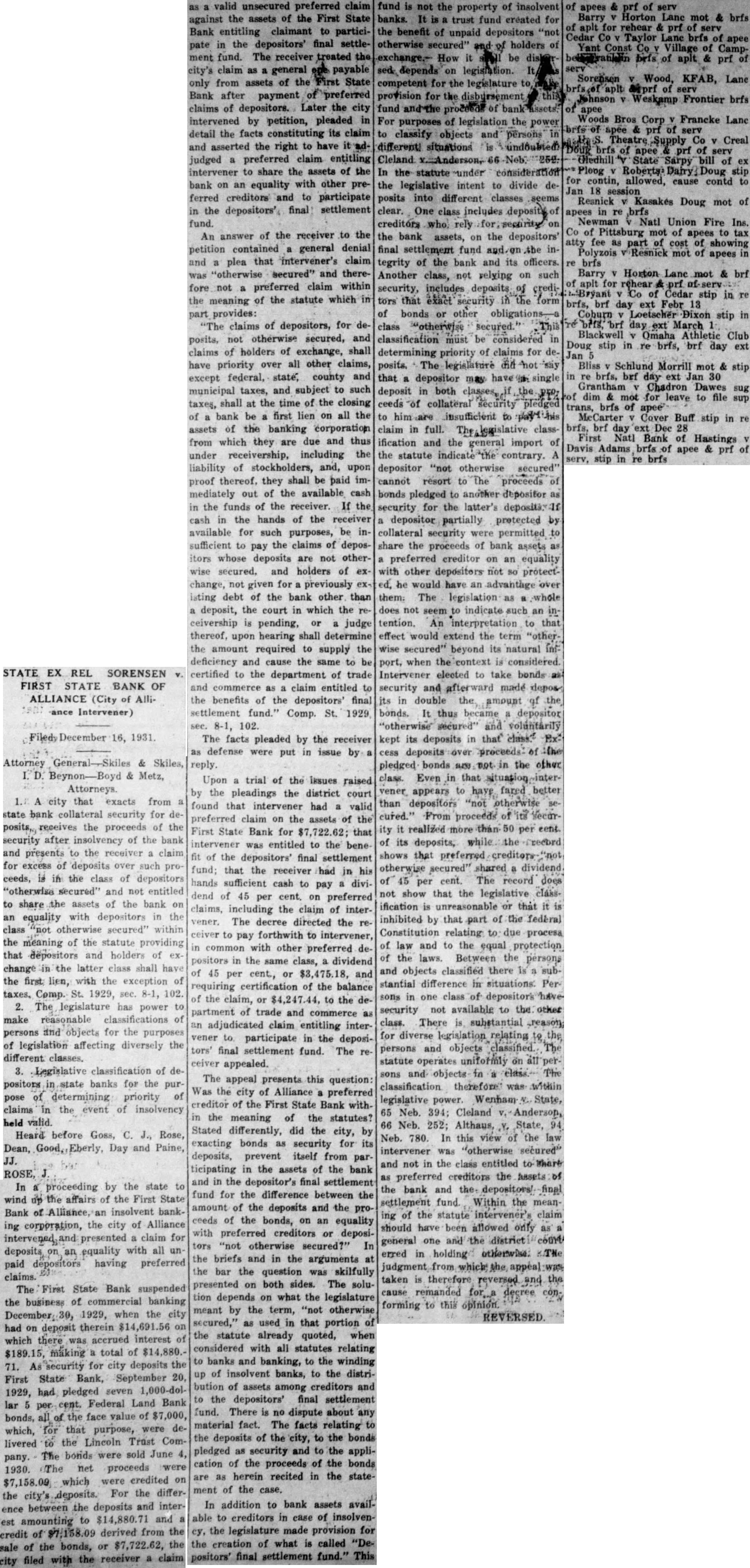 In addition to bank assets available to creditors in case of insolvency, the legislature made provision for the creation of what is called "De- fund is not the property of insolvent banks. It is a trust fund created for the benefit of unpaid depositors "not otherwise secured" and of holders of exchange.- How it be disken sed: depends on legislation. It competent for the legislature to provision for the disbursement this fund and the proceeds of bank For purposes of legislation the power to classify objects and persons in different! situations is undoubted In the statute under consideration the legislative intent to divide deposits into different classes seems clear. One class includes deposits of creditors who rely for, security on the bank assets, on the depositors' final settlement fund and.on the integrity of the bank and its officers. Another class, not relying on such security, includes deposits of creditors that exact security in the form of bonds or other obligations-a class "otherwise secured. This classification must be considered in determining priority of claims for deposits, The legislature did not say that a depositor may have in single deposit in both classes, if the PEO, ceeds of collateral security pledged to him are insufficient to claim in full. he/legislative classification and the general import of the statute indicate the contrary. A depositor "not otherwise secured' cannot resort to The proceeds of bonds pledged to another depositor as security for the latter's depositive a depositor partially protected by collateral security were permitted to share the proceeds of bank assets as a preferred creditor on an equality with other depositors not so protected, he would have an advantage over them: The legislation as a whole does not seem to indicate such an intention. An interpretation to that effect would extend the term "otherwise secured" beyond its natural int port, when the context is considered. Intervener elected to take bonds as security and afterward made deposits in double the amount of the bonds. It thus became a depositor "otherwise" secured" and voluntarily kept its deposits in that class." Excess deposits over proceeds: of the pledged bonds are not in the other class. Even in that situation intervener appears to have fared better than depositors "not otherwise secured." From proceeds of its Security it realized more than 50 per eent. of its deposits, while the "record shows that preferred creditors "not otherwise secured" shared a dividend of 45 per cent. The record does not show that the legislative class ification is unreasonable or that it is inhibited by that part of the federal Constitution relating to due process of law and to the equal protection of the laws. Between the persons and objects classified there is a substantial difference in situations. Persons in one class of depositors have security not available to the other class. There is substantial ,reason; for diverse legislation relating to the persons and objects classified. The statute operates uniformly on all persons and objects in a class.- The classification therefore was within legislative power. Wenham V. State, 65 Neb. 394; Cleland Anderson, 66 Neb. 252; Althaus, Y. State, 94 Neb. 780. In this view of the law intervener was "otherwise secured" and not in the class entitled to share as preferred creditors the Assets of the bank and the. depositors! final settlement fund. Within the meaning of the statute intervener's claim should have been allowed only as a general one and the district courts erred in holding otherwise. K/TNe judgment from which the appeal was taken is therefore reversed and the cause remanded for..a decree conforming to this opinion. REVERSED of apees & prf of serv Barry V Horton Lane mot & brfs of aplt for rehear & prf of serv Cedar Co V Taylor Lane brfs of apee Yant Const Co Village of Campbrfs of aplt & prf of serv Sorensen V Wood, KFAB, Lane Johnson V Weskamp Frontier brfs of apee Woods Bros Corp V Francke Lane brfs of apee & prf of serv S. Theatre Supply Co V Creal Doug brfs of apee & prf of serv Gledhill State Sarpy bill of ex Plong V Roberts: Dairy stip for contin, allowed, cause contd to Jan 18 session Resnick V/ Kasakés Doug mot of apees in re brfs Newman Natl Union Fire Ins. Co of Pittsburg mot of apees to tax atty fee as part of cost of showing Polyzois Resnick mot of apees in re brfs Barry V Horton Lane mot & brf of aplt for rehear & prf Byant Co of Cedar stip in re brfs, brf day ext Febr 13 Cohurn Loetscher Dixon stip in re brfs, brf day ext March Blackwell v Omaha Athletic Club Doug stip in re brfs, brf day ext Jan Bliss V Schlund Morrill mot & stip in re brfs, brf day ext Jan 30 Grantham V Chadron Dawes sug of dim & mot for leave to file sup trans, brfs of apee McCarter V Cover Buff stip in re brfs, brf day ext Dec 28 First Natl Bank of Hastings Davis Adams brfs of apee & prf of serv, stip in re brfs