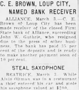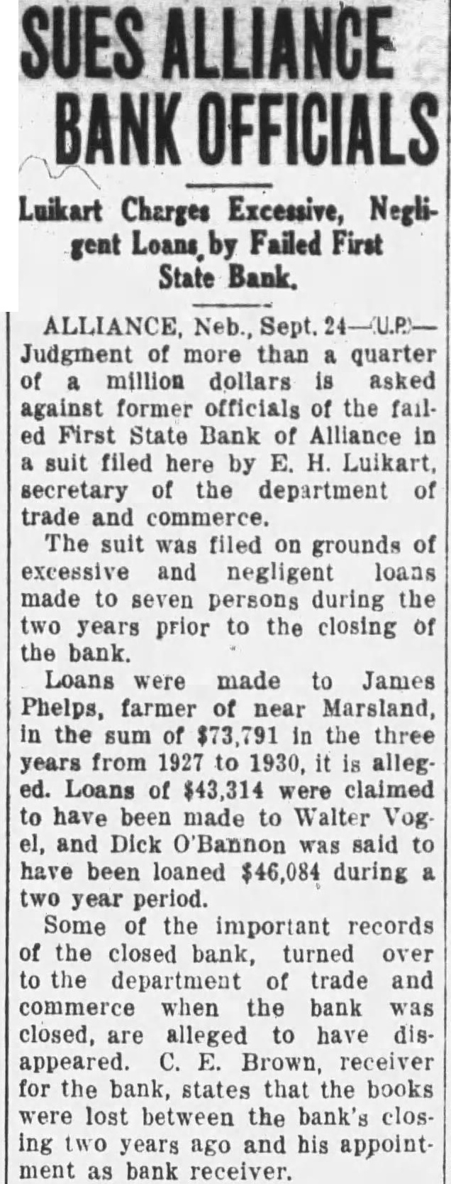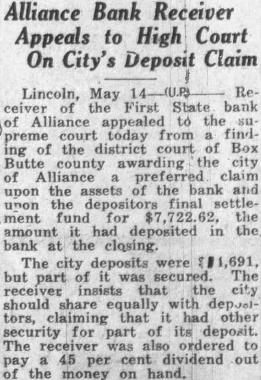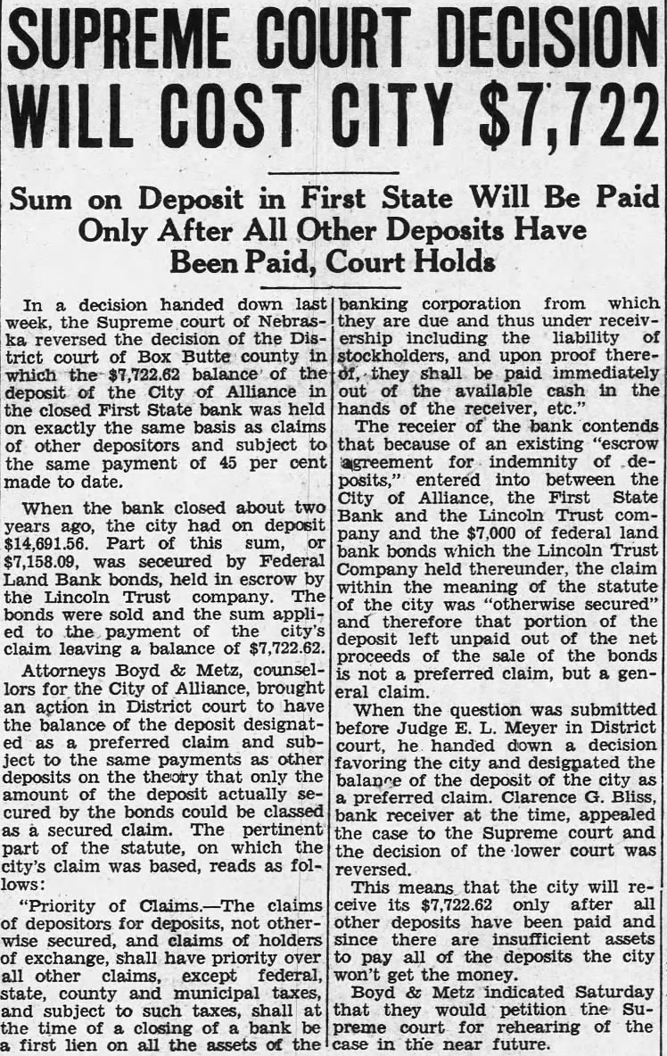 STATE EX REL SORENSEN V. FIRST STATE BANK OF ALLIANCE (City of Alliance Intervener)
