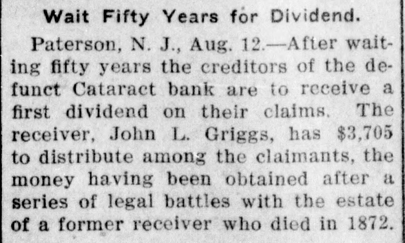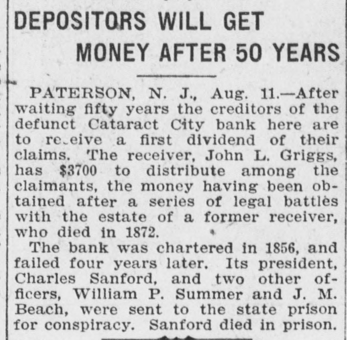 GET FUNDS AFTER FIFTY YEARS. Creditors Receive Dividend on Cataract City Bank. Paterson, N. J., Aug. 11.-After waiting 50 years the creditors of the defunct Cataract City bank here are to receive a first dividend on their claims. The receiver, John L. Griggs, has $3,705, to distribute among the claimants, the money having been obtained after a series of legal battles with the estate of a former receiver who died in 1872. The bank was chartered in 1856 and failed four years later. Its president, Charles Sanford. and two other officials, William P. Sumner and J. M. Beach, were sent to the state prison for conspiracy. Sanford died in prison.