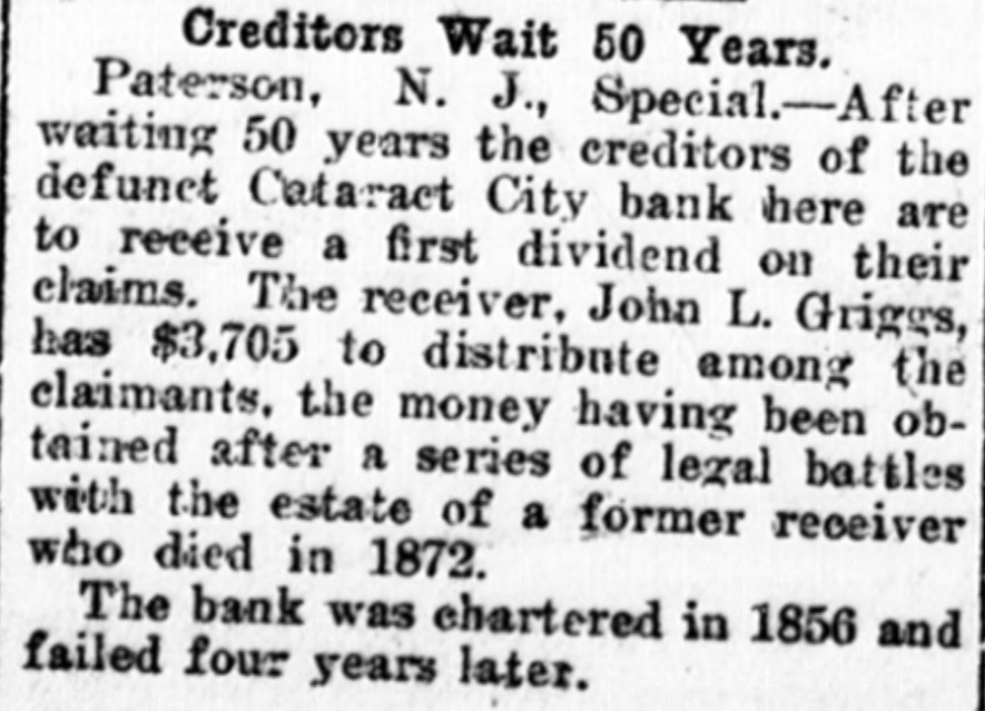 Creditors Wait 50 Years. Paterson, N. J., Special.-After waiting 50 years the creditors of the defunct Cataract City bank here are to receive a first dividend on their claims. The receiver, John L. Griggs, has $3,705 to distribute among the claimants, the money having been obtained after a series of legal battles with the estate of a former receiver who died in 1872. The bank was chartered in 1856 and failed four years later.