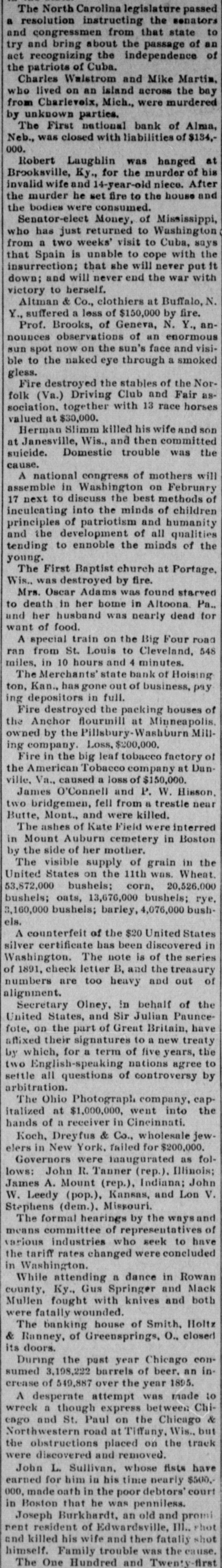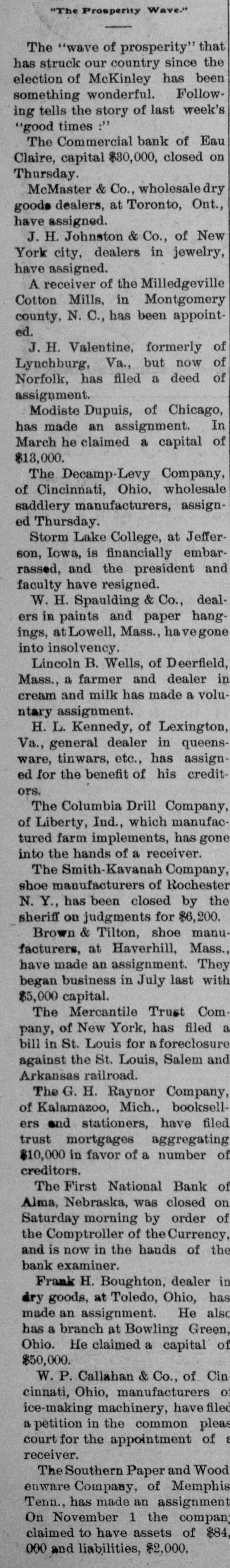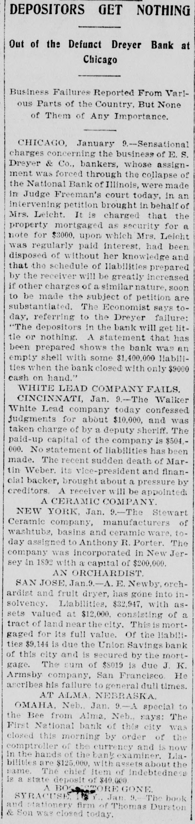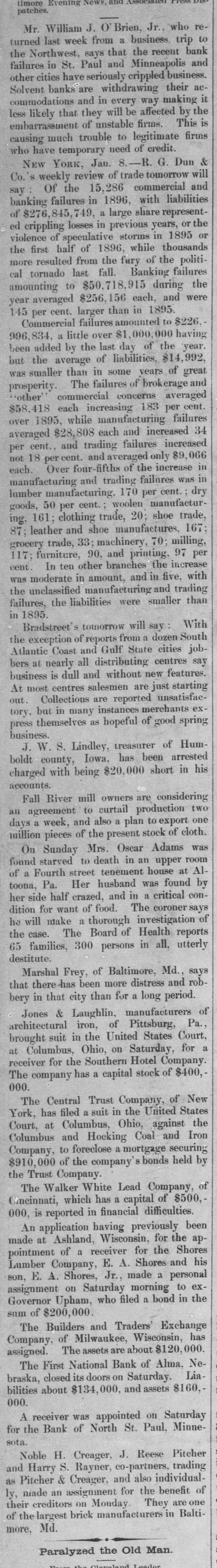 commodations and in every way less likely that they will be affected by the embarrassment of unstable firms. This is causing much trouble to legitimate firms who have temporary need of credit. NEW YORK, Jan. 8.-R. G. Dun & Co. 8 weekly review of trade tomorrow will say Of the 15,286 commercial and banking failures in 1896, with liabilities of $276,845,749, a large share represented crippling losses in previous years, or the violence of speculative storms in 1895 or the first half of 1896, while thousands more resulted from the fury of the political tornado last fall. Banking failures amounting to $50,718,915 during the year averaged $256, each, and were 145 per cent. larger than in 1895. Commercial failures amounted to $226. 996,834, a little over $1, 000, 000 having been added by the last day of the year. but the average of liabilities, $14,992, was smaller than in some years of great prosperity. The failures of brokerage and 'other' commercial concerns averaged $58,418 each increasing 183 per cent. over 1895, while manufacturing failures averaged $28,808 each and increased 34 per cent., and trading failures increased not 18 per cent. and averaged only $9,066 each. Over four-fifths of the increase in manufacturing and trading failures was in lumber manufacturing, 170 per cent. dry goods, 50 per cent.; woolen manufacturing, 161; clothing trade, 20; shoe trade, 87; leather and shoe manufactures, 167; grocery trade, 33; machinery, 70; milling, 117; furniture, 90, and printing, 97 per cent. In ten other branches the increase was moderate in amount, and in five, with the unclassified manufacturing and trading failures, the liabilities were smaller than in 1895. Bradstreet's tomorrow will say With the exception of reports from a dozen South Atlantic Coast and Gulf State cities jobbers at nearly all distributing centres say business is dull and without new features. At most centres salesmen are just starting out. Collections are reported unsatisfactory, but in many instances merchants express themselves as hopeful of good spring business. J. W. S. Lindley, treasurer of Humboldt county, Iowa, has been arrested charged with being $20,000 short in his accounts. Fall River mill owners are considering an agreement to curtail production two days a week, and also a plan to export one million pieces of the present stock of cloth. On Sunday Mrs. Oscar Adams was found starved to death in an upper room of a Fourth street tenement house at Altoona, Pa. Her husband was found by her side half crazed, and in a critical condition for want of food. The coroner says he will make a thorough investigation of the case. The Board of Health reports 65 families, 300 persons in all, utterly destitute. Marshal Frey, of Baltimore, Md., says that there-has been more distress and robbery in that city than for a long period. Jones & Laughlin, manufacturers of architectural iron, of Pittsburg, Pa., brought suit in the United States Court, at Columbus, Ohio, on Saturday, for a receiver for the Southern Hotel Company. The company has a capital stock of $400, 000. The Central Trust Company, of New York, has filed a suit in the United States Court, at Columbus, Ohio, against the Columbus and Hocking Coal and Iron Company, to foreclose a mortgage securing $910,000 of the company's bonds held by the Trust Company. The Walker White Lead Company, of Cincinnati, which has a capital of $500,000, is reported in financial difficulties. An application having previously been made at Ashland, Wisconsin, for the appointment of a receiver for the Shores Lumber Company, E. A. Shores and his son, E. A. Shores, Jr., made a personal assignment on Saturday morning to exGovernor Upham, who filed a bond in the sum of $200,000. The Builders and Traders' Exchange Company, of Milwaukee, Wisconsin, has assigned. The assets are about $120,00 The First National Bank of Alma, Nebraska, closed its doors on Saturday. Liabilities about $134,000, and assets $160,000. A receiver was appointed on Saturday for the Bank of North St. Paul, Minnesota. Noble H. Creager, J. Reese Pitcher and Harry S. Rayner, co-partners. trading as Pitcher & Creager, and also individually, made an assignment for the benefit of their creditors on Monday. They are one of the largest brick manufacturers in Baltimore, Md. Paralyzed the Old Man. Loador