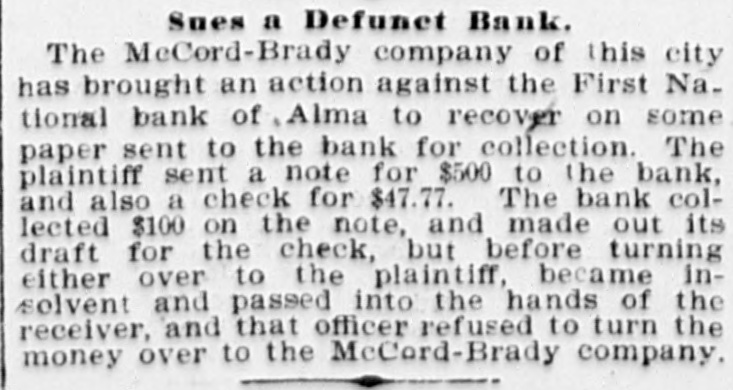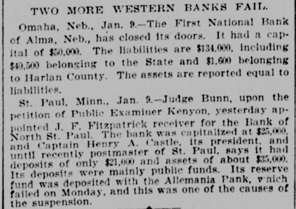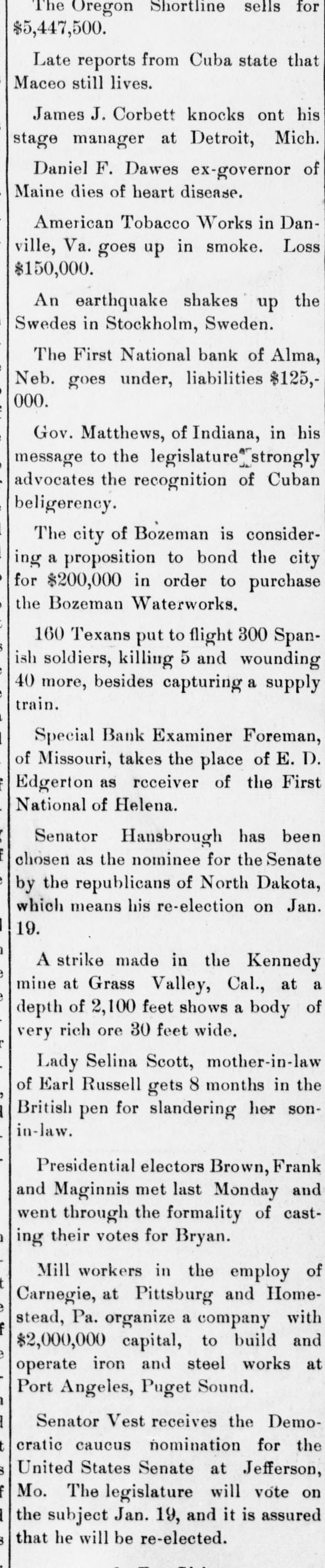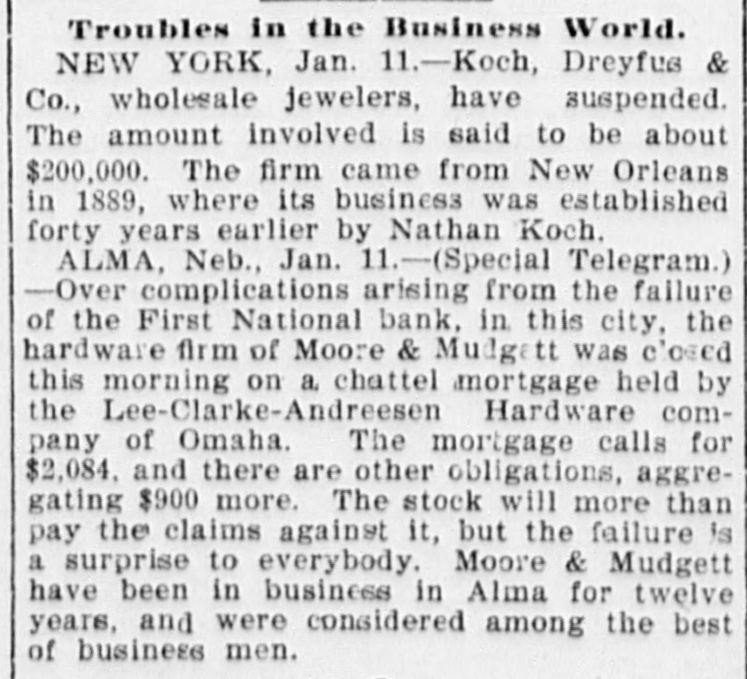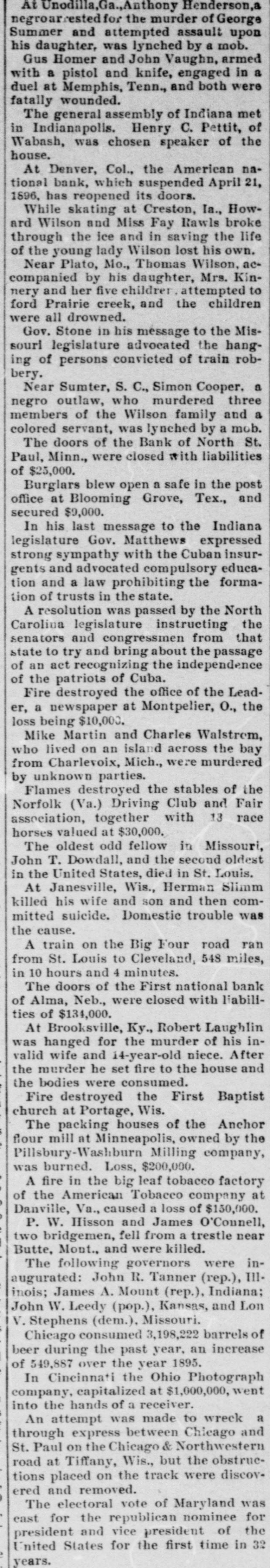 commodations and in every way less likely that they will be affected by the embarrassment of unstable firms. This is causing much trouble to legitimate firms who have temporary need of credit. NEW YORK, Jan. 8.-R. G. Dun & Co. 8 weekly review of trade tomorrow will say Of the 15,286 commercial and banking failures in 1896, with liabilities of $276,845,749, a large share represented crippling losses in previous years, or the violence of speculative storms in 1895 or the first half of 1896, while thousands more resulted from the fury of the political tornado last fall. Banking failures amounting to $50,718,915 during the year averaged $256, each, and were 145 per cent. larger than in 1895. Commercial failures amounted to $226. 996,834, a little over $1, 000, 000 having been added by the last day of the year. but the average of liabilities, $14,992, was smaller than in some years of great prosperity. The failures of brokerage and 'other' commercial concerns averaged $58,418 each increasing 183 per cent. over 1895, while manufacturing failures averaged $28,808 each and increased 34 per cent., and trading failures increased not 18 per cent. and averaged only $9,066 each. Over four-fifths of the increase in manufacturing and trading failures was in lumber manufacturing, 170 per cent. dry goods, 50 per cent.; woolen manufacturing, 161; clothing trade, 20; shoe trade, 87; leather and shoe manufactures, 167; grocery trade, 33; machinery, 70; milling, 117; furniture, 90, and printing, 97 per cent. In ten other branches the increase was moderate in amount, and in five, with the unclassified manufacturing and trading failures, the liabilities were smaller than in 1895. Bradstreet's tomorrow will say With the exception of reports from a dozen South Atlantic Coast and Gulf State cities jobbers at nearly all distributing centres say business is dull and without new features. At most centres salesmen are just starting out. Collections are reported unsatisfactory, but in many instances merchants express themselves as hopeful of good spring business. J. W. S. Lindley, treasurer of Humboldt county, Iowa, has been arrested charged with being $20,000 short in his accounts. Fall River mill owners are considering an agreement to curtail production two days a week, and also a plan to export one million pieces of the present stock of cloth. On Sunday Mrs. Oscar Adams was found starved to death in an upper room of a Fourth street tenement house at Altoona, Pa. Her husband was found by her side half crazed, and in a critical condition for want of food. The coroner says he will make a thorough investigation of the case. The Board of Health reports 65 families, 300 persons in all, utterly destitute. Marshal Frey, of Baltimore, Md., says that there-has been more distress and robbery in that city than for a long period. Jones & Laughlin, manufacturers of architectural iron, of Pittsburg, Pa., brought suit in the United States Court, at Columbus, Ohio, on Saturday, for a receiver for the Southern Hotel Company. The company has a capital stock of $400, 000. The Central Trust Company, of New York, has filed a suit in the United States Court, at Columbus, Ohio, against the Columbus and Hocking Coal and Iron Company, to foreclose a mortgage securing $910,000 of the company's bonds held by the Trust Company. The Walker White Lead Company, of Cincinnati, which has a capital of $500,000, is reported in financial difficulties. An application having previously been made at Ashland, Wisconsin, for the appointment of a receiver for the Shores Lumber Company, E. A. Shores and his son, E. A. Shores, Jr., made a personal assignment on Saturday morning to exGovernor Upham, who filed a bond in the sum of $200,000. The Builders and Traders' Exchange Company, of Milwaukee, Wisconsin, has assigned. The assets are about $120,00 The First National Bank of Alma, Nebraska, closed its doors on Saturday. Liabilities about $134,000, and assets $160,000. A receiver was appointed on Saturday for the Bank of North St. Paul, Minnesota. Noble H. Creager, J. Reese Pitcher and Harry S. Rayner, co-partners. trading as Pitcher & Creager, and also individually, made an assignment for the benefit of their creditors on Monday. They are one of the largest brick manufacturers in Baltimore, Md. Paralyzed the Old Man. Loador