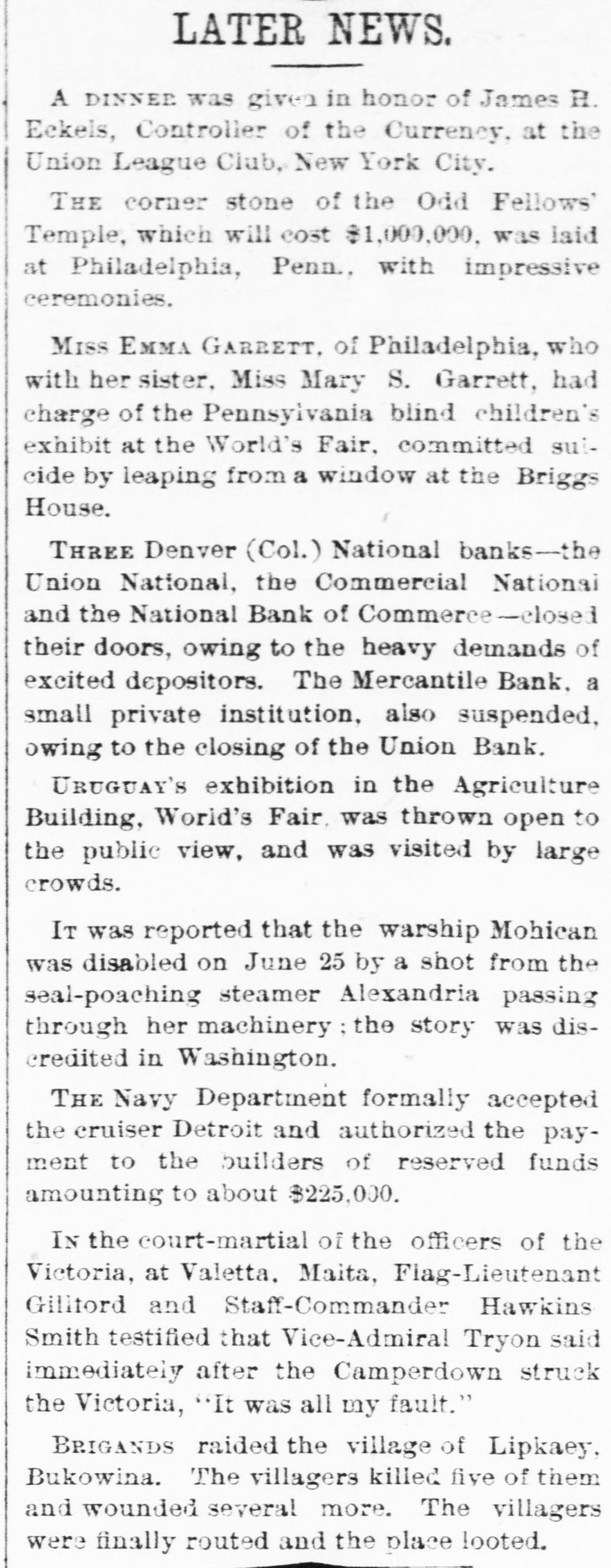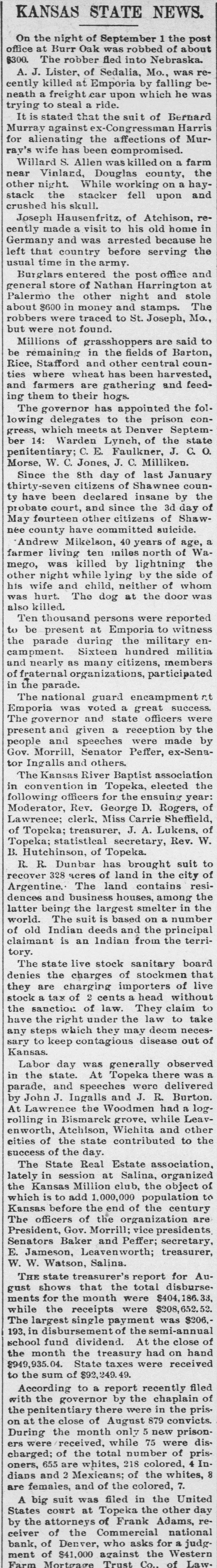 The national guard encampment rt Emporia was voted a great success. The governor and state officers were present and given a reception by the people and speeches were made by Gov. Morrill, Senator Peffer, ex-Senator Ingalls and others.