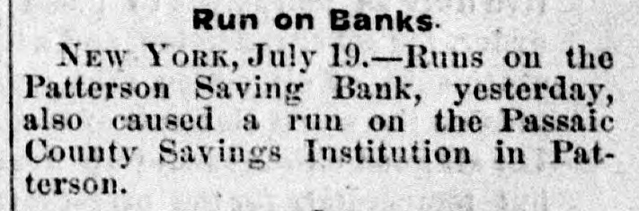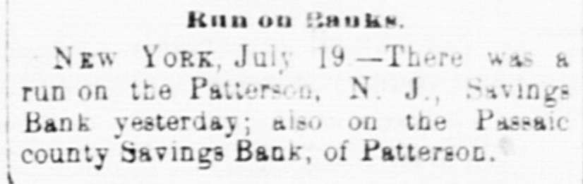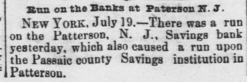 The failure of the Insurance Company...caused a run upon the Paterson Savings Institution yesterday...A slight run was made also upon the Passaic County Savings Institution, about $3,000 being withdrawn in small sums.