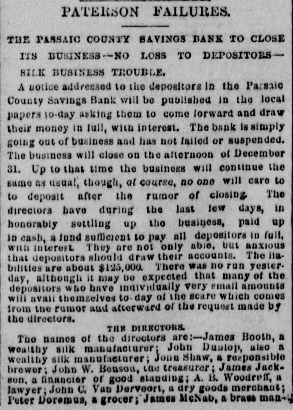 PATERSON FAILURES. THE PASSAIC COUNTY SAVINGS BANK TO CLOSE ITS BUSINESS-NO LOSS TO DEPOSITOESSILK BUSINESS TROUBLE. A notice addressed to the depositors in the Parsaic County Savings Bank will be published in the local papers 10-day asking them to come forward and draw their money in full, with interest. The bank is simply going out of business and has not failed or suspended. The business will close on the afternoon of December 31. Up to that time the business will continue the same as usual, though, at course, no one will care to to deposit after the rumor of closing The directors have during the last few days, in honorably settling up the business, paid up in cash, a fund sufficient to pay all depositors in full. with interest. They are not only able, but anxious that depositors should draw their accounts. The liabilities are about $125,000. There was no run yesterday, although it may be expected that many of the depositors WHO have individually very small amounts will avail themselves to. day of the scare which comes from the rumor and afterward of the request made by the directors. THE DIRECTORS. The names of the directors are:-James Booth, a wealthy silk manufacturer; John Dualop, also a wealthy silk manufacturer; John Shaw, a responsible brewer; John W. Benson, cae treasurer; James Jackson, a financier of good standing; A. B. Woodreff, a lawyer; John C. Van Dervoort, a ary goods merchant; Peter Doremus, a grocer; James McNab, a brass man-i