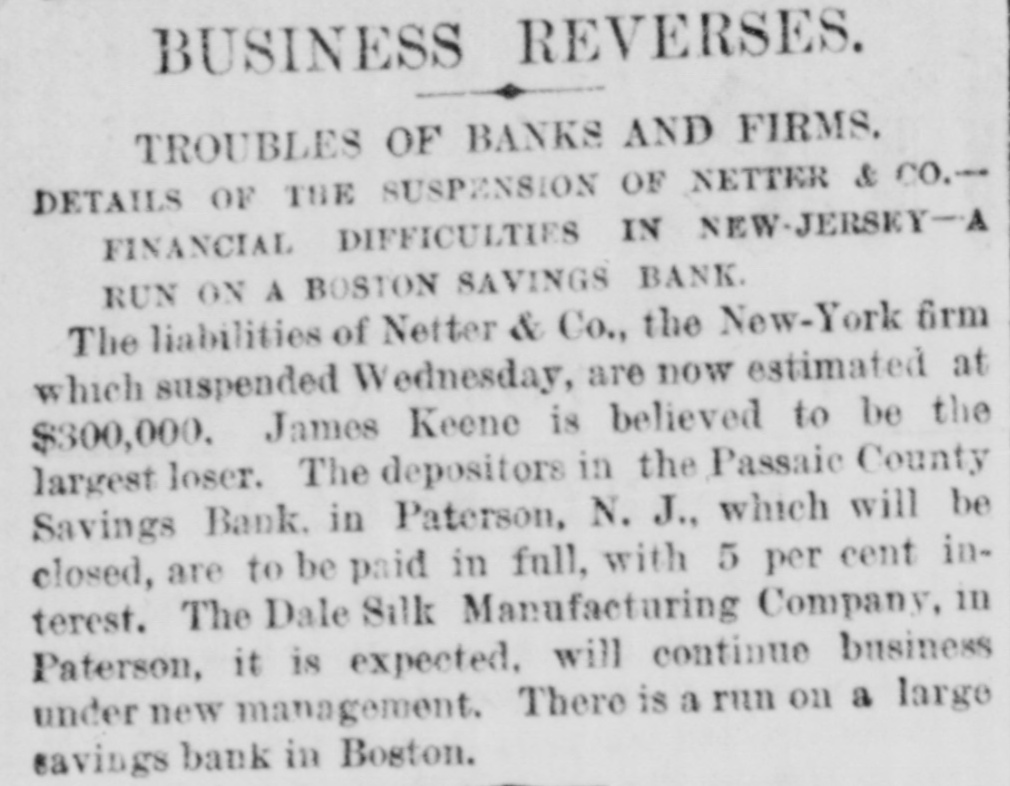 BUSINESS REVERSES. TROUBLES OF BANKS AND FIRMS. DETAILS OF THE SUSPENSION OF NETTER & CO.FINANCIAL DIFFICULTIES IN NEW-JERSEY-A RUN ON A BOSTON SAVINGS BANK. The liabilities of Netter & Co., the New-York firm which suspended Wednesday, are now estimated at $300,000. James Keene is believed to be the largest loser. The depositors in the Passaic County Savings Bank. in Paterson, N. J., which will be closed, are to be paid in full, with 5 per cent interest. The Dale Silk Manufacturing Company, in Paterson, it is expected, will continue business under new management. There is a run on a large savings bank in Boston.