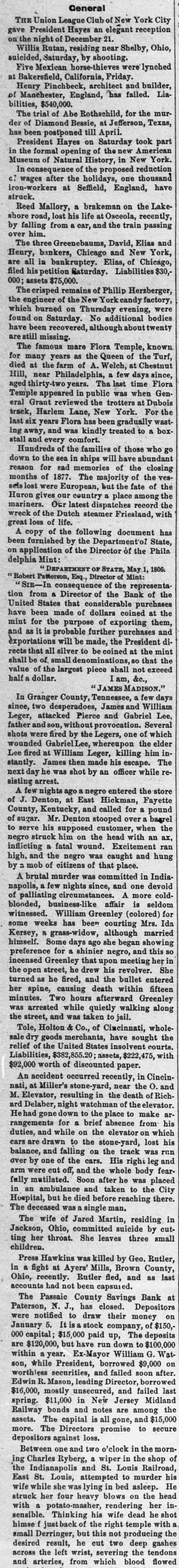 General THE Union League Club of New York City gave President Hayes an elegant reception on the night of December 21. Willis Rutan, residing near Shelby, Ohio, suicided, Saturday, by shooting. Five Mexican horse-thieves were lynched at Bakersfield, California, Friday. Henry Pinchbeck, architect and builder, of Manéhester, England, has failed. Liabilities, $540,000. The trial of Abe Rothschild, for the murder of Diamond Bessie, at Jefferson, Texas, has been postponed till April. President Hayes on Saturday took part in the formal opening of the new American Museum of Natural History, in New York. In consequence of the proposed reduction of wages after the holidays, one thousand iron-workers at Seffield, England, have struck. Reed Mallory, a brakeman on the Lakeshore road, lost his life at Osceola, recently, by falling from a car, and the train passing over him. The three Greenebaums, David, Elias and Henry, bankers, Chicago and New York, are all in bankruptcy. Elias, of Chicago, filed his petition Saturday. Liabilities $30,000; assets $75,000. The crisped remains of Philip Herzberger, the engineer of the New York candy factory, which burned on Thursday evening, were found on Saturday. No additional bodies have been recovered, although about twenty are still missing. The famous mare Flora Temple, known for many years as the Queen of the Turf, died at the farm of A. Welch, at Chestnut Hill, near Philadelphia, a few days since, aged thirty-two years. Tha last time Flora Temple appeared in public was when General Grant reviewed the trotters at Dubois track, Harlem Lane, New York. For the last six years Flora has been gradually wasting away, and was kindly treated to a boxstall and every comfort. Hundreds of the families of those who go down to the sea in ships will have abundant reason for sad memories of the closing months of 1877. The majority of the vessels lost were European, but the fate of the Huron gives our country a place among the mariners. Our latest dispatches record the wreck of the Dutch steamer Friesland, with great loss of life. A copy of the following document has been furnished by the Departmento1 State, on application of the Director of the Phila delphia Mint: DEPARTMENT OF STATE, May 1, 1806. 'Robert Patterson, Esq., Director of Mint: 'SIR-In consequence of the representathe JO Bank the JO Director 8 more the United States that considerable purchases have been made of dollars coined at the mint for the purpose of exporting them, pus prechases probbble SI # SU pus exportations will be made, the President directs that all silver to be coined at the mint shall be of small denominations, 80 that the value of the largest piece shall not exceed half dollar. "orp Ima JAMES MADISON." In Granger County, Tennessee, a few days since, two desperadoes, James and William Leger, attacked Pierce and Gabriel Lee, father and son, without provocation. Several shots were fired by the Legers, one of which wounded GabrielL whereupon the elder Lee fired at William Leger, killing him instantly. James then made his escape. The next day he was shot by an officer while resisting arrest. A few nights ago negro entered the store Fanatte Holdama, Fast 18 Denton, T JO County, Kentucky, and called for a pound bankel 8 stooped Denton "" washing JO to serve his supposed customer, when the negro struck him on the head with an ax, inflicting a fatal wound. Excitement ran high, and the negro was caught and hung place. that JO citizens JO qom c &q A brutal murder was committed in Indianapolis, a few nights since, and one devoid of palliating circumstances. A more coldblooded, business-like affair is seldom witnessed. William Greenley (colored) for some weeks has been courting Mrs. Ida Kersey, a grass-widow, although married himself. Some days ago she began showing preference for a shinier negro, and this so incensed Greenley that upon meeting her in the open street, he drew his revolver. She turned as he fired, and the bullet entered her spine, causing death within fifteen minutes. Two hours afterward Greenley was arrested while quietly walking along the street, and was taken to jail. Tole, Holton & Co., of Cincinnati, wholesale dry goods merchants, have sought the relief of the United States insolvent courts. Liabilities, $382,855.20; assets, $222,475, with $92,000 worth of discounted paper. An accident occurred recently, in Cincinnati, at Miller's stone-yard, near the O. and M. Elevator, resulting in the death of Richard Delaber, night watchman of the elevator. Hehad gone down to the place to make arrangements for a brief absence from his duties, and while on the elevator on which cars are drawn to the stone-yard, lost his balance, and falling On the track was run over by one of the cars. His right leg and arm were cut off, and the whole body fearfully mutilated. Soon after he was placed in an ambulance and taken to the City Hospital, but he died before reaching there. The deceased was a single man. The wife of Jared Martin, residing in Jackson, Ohio, committed suicide by cut. ting her throat. She leaves three small children. Press Hawkins was killed by Geo. Rutler, in a fight at Ayers' Mills, Brown County, Ohio, recently. Rutler fled, and as last accounts had not been capsuied. The Passaic County Savings Bank at Paterson, N. J., has closed. Depositors were notified to draw their money on January 5. It stock company, of $150,000 capital; $15,000 paid up, The deposits are $120,000, but have run down to $100,000 within a year. Ex-Mayor William G. Wat son, while President, borrowed $9,000 on worthless securities, and failed soon after Edwin R. Mason, leading Director, borrowed $16,000, mostly unsecured, and failed last spring. $11,000 in New Jersey Midland Railway bonds and notes are among the assets. The capital is all gone, and $15,000 more. The Directors promise to secure depositors against loss. Between one and two o'clock in the morning Charles Ryberg, a wiper in the shop the Indianapolis and St. Louis Ra