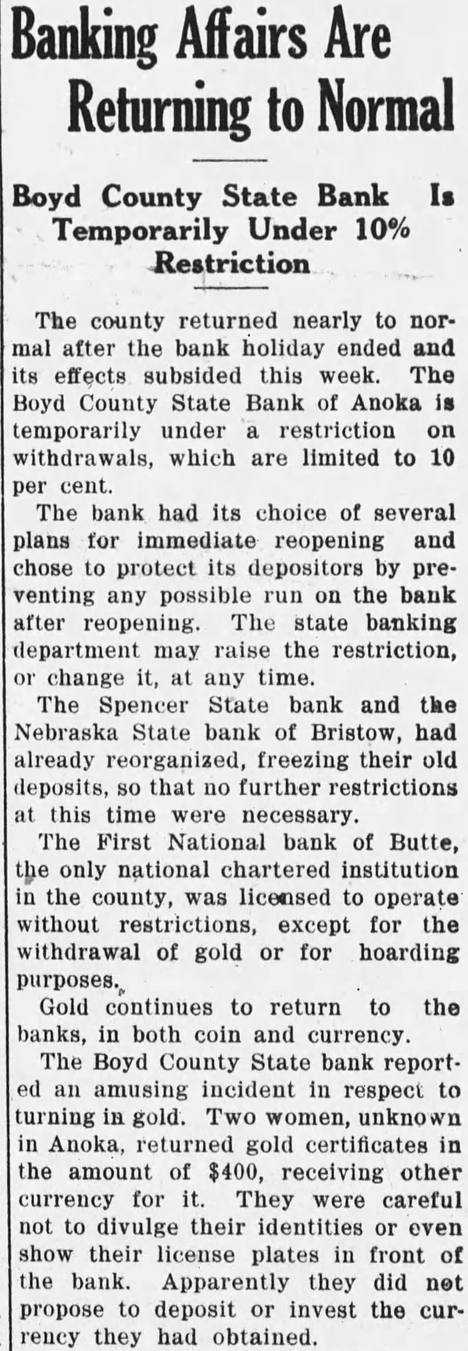 Banking Returning to Boyd County State Bank Temporarily Under 10% Restriction The county returned nearly to normal after the bank holiday ended and its effects subsided this week. The Boyd County State Bank of Anoka temporarily under restriction withdrawals, which limited to The bank had its choice of several plans for immediate reopening and chose protect its depositors by preventing any possible run on the bank after reopening. The state banking department may raise the restriction, change any time. The Spencer State bank and the Nebraska State bank Bristow, had already reorganized, freezing their old deposits, that further restrictions this time were necessary. The First National bank of Butte, only national chartered institution the county, was licensed to operate without restrictions, except for the withdrawal of gold or for hoarding purposes. Gold continues to return to the banks, in both coin and currency. The Boyd County bank reportamusing incident respect to turning women, unknown Anoka, returned gold certificates the amount $400, receiving other currency for They were careful divulge their identities even show their license plates in front the bank. Apparently they did not propose to deposit invest the currency they had obtained.