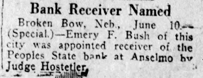 Emery F. Bash of this city was appointed receiver of the Peoples State bank at Anselmo by Judge Hostetler