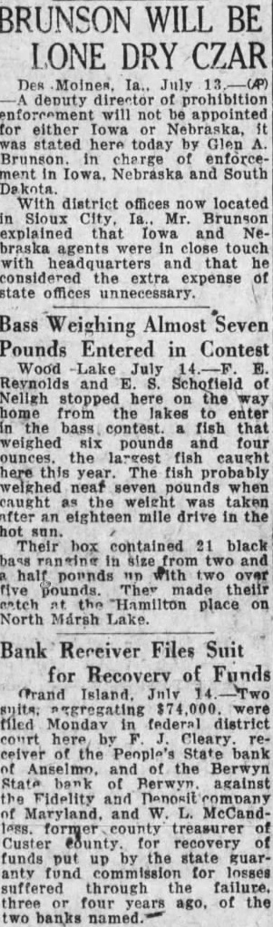 BRUNSON WILL BE LONE DRY CZAR Des Moines, Ia.. July deputy director of prohibition enforcement will not be appointed for either Iowa or Nebraska, it was stated here today by Glen A Brunson in charge of enforcement in Iowa. Nebraska and South Dakota. With district offices now located in Sioux City, Ia., Mr. Brunson explained that Iowa and Nebraska agents were in close with headquar and that he considered the extra expense of state offices unnecessary. Bass Weighing Almost Seven Pounds Entered in Contest Wood Lake July 14.-F. E. Reynolds and E. S. Schofield of Neligh stopped here on the way home from the lakes to enter in the bass contest. fish that weighed six pounds four ounces. the largest fish caught here this year. The fish probably weighed neat seven pounds when caught as the weight was taken after an eighteen mile drive in the hot sun. Their box contained 21 black bass in size from two and half pounds "D with two over five pounds. They made their eatch "Hamilton place on North Marsh Lake Bank Receiver Files Suit for Recoverv of Funds Grand Island. July Two aggregating 000. were filed Mondav in federal district court here by receiver of the People's State bank of Anselmo and of the Berwyn State bank of Berwyn. against the Fidelity and Denosit company of Maryland. and W. L. McCandless. former county treasurer Custer County. for recovery of funds put up by the state guaranty fund commission for losses suffered through the failure. three or four years ago, of the two banks