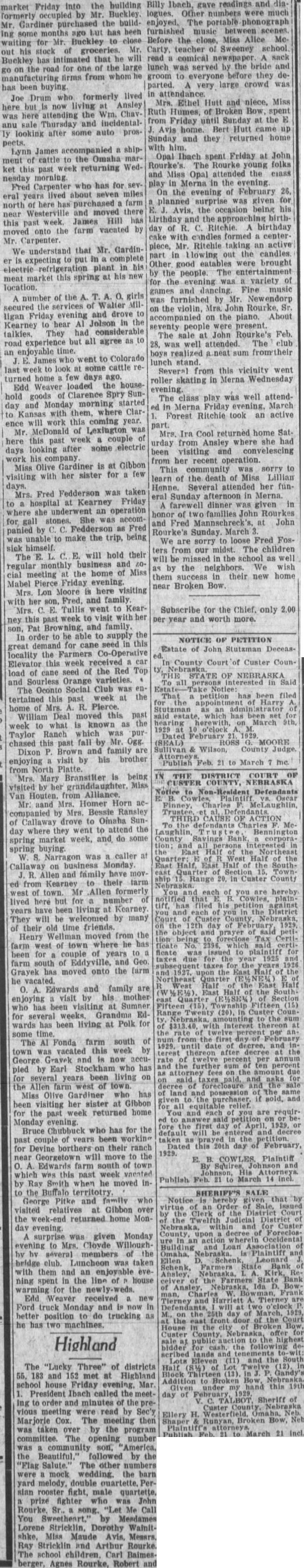 Mr. Gardiner purchased the buildwaiting for Mr. Buckley to close out his stock of groceries. Mr. Buckley has intimated that he will go on the road for one of the large manufacturing firms from whom he has been buying. in Joe Drum who formerly lived here but is now living at Ansley was here attending the Wm. Chavanu sale Thursday and incidentally looking after some auto prospects. Lynn James accompanied a shipment of cattle to the Omaha market this past week returning Wednesday morning. Fred Carpenter who has for several years lived about seven miles north of here has purchased farm near Westerville and moved there this past week. James Hill has moved onto the farm vacated by Carpenter We understand that Mr. Cardiner is expecting to put in complete electric refrigeration plant in his meat market this spring at his new location. A number of the A. T. A. O. girls secured the services of Walter Mil ligan Friday evening and drove to Kearney to hear Al Jolson in the talkies. They had considerable road experience but all agree as to an enjoyable time. J. E. James who went to Colorado last week to look at some cattle returned home few days ago. Edd Weaver loaded the house hold goods of Clarence Spry Sunday and Monday morning started to Kansas with them, where Clarence will work this coming year. Mr. McDonald of Lexington was here this past week couple of days looking after some electric work his company Miss Olive Gardiner is at Gibbon visiting with her sister for a few days. Mrs. Fred Fedderson was taken to a hospital at Kearney Friday where she underwent an operation for gall stones. She was accompanied by C. Fedderson as Fred was unable to make the trip, being sick himself. The E. L. C. E. will hold their regular monthly business and 10cial meeting at the home of Miss Mabel Pierce Friday evening. Mrs. Lon Moore is here visiting with her son, Fred. and family Mrs. C. E. Tullis went to Kearney this past week to visit with her son, Pat Browning, and family. In order to be able to supply the great demand for cane seed in this locality the Farmers Co-Operative Elevator this week received car load of cane seed of the Red Top and Sourless Orange varieties. The Oconto Social Club was entertained this past week at the home of Mrs. R. Pierce. William Deal moved this past week to what is known as the Taylor Ranch which was pur chased this past fall by Mr. Ogg. Dixon P. Brown and family are enjoying a visit by his brother from North Platte. Mrs. Mary BranstHer is being visited by her granddaughter, Miss Van Houten. from Alliance Mr: and Mrs. Homer Horn accompanied by Mrs. Bessie Ransley of Callaway drove to Oinaha Sunday where they went to attend the spring market week, and do some spring buying W. S. Narragon was a caller at Callaway on business Monday R. Allen and family have mov. ed from Kearney to their farm west of town. Mr Allen formerly lived here but for number of years have been living at Kearney They will be welcomed by many of their old time friends. Henry Wellman moved from the farm west of town where he has been for couple of years to farm south of Eddyville, and Geo Grayek has moved onto the farm he vacated. O. A. Edwards and family are enjoying visit by his mother who has been visiting at Sumner for several weeks, Grandma Edwards has been living at Polk for some The AI Fonda farm south of town was vacated this week by George Gravek and is now accupied by Earl Stockham who has several years been living on the Allen farm west of town. Miss Olive Gardiner who has been visiting her sister at Gibbon for the past week returned home Monday evening. Bruce Chubbuck who has for the past couple of vears been working for Devine borthers on their ranch near Georgetown will move to the O. A. Edwards farm south of town which was this past week vacated by Ray Smith when he moved into the Buffalo territotry George Pitke and family who visited relatives at Gibbon over the week end returned home Monday evening. A surprise was given Monday evening to Mrs. Cloyde Willoughhv hv several members of the bridge club. Luncheon was taken with them and an enjoyable evening spent in the line of R house warming for the newly-weds. Edd Weaver received a new Ford truck Monday and is now In better position to do trucking as he has two machines. Highland The "Lucky Three" of districts 56. 183 and 152 met at Highland school house Friday evening, Mar. President Ibach called the meeting to order and minutes of the previous meeting were read by Sec'y Marjorie Cox. The meeting then was taken over by the program committee. The opening number was community son. America. the Beautiful.' followed by the "Flag Salute.' The other numbers were mock wedding. the barn yard melody, double quartette. Persian rooster fight, male quartette. prize fighter who was John Rourke. Sr.. a song. "Let Me Call You Sweetheart," by Mesdames Lorene Stricklin, Dorothy Wainitshke. Miss Maude Avis, Messrs. Ray Stricklin and Arthur Rourke. The school children. Carl Baimesberger, Agnes Rourke, Robert and enjoyed, The portable phonograph Before the close, Miss Alice Mc Carty, teacher of Sweeney school read comical newspaper A sack lunch was served by the bride and groom to everyone before they departed. A very large crowd was attendance. Mrs. Ethel Hutt and niece, Miss Ruth Humes, of Broken Bow, spent from Friday until Sunday at the E Avis home. Bert Hutt came up Sunday and they returned home with him. Opal Ibach spent Friday at John Rourke's. The Rourke young folks and Miss Opal attended the class play in Merna in the evening On the evening of February 26, planned surprise was given for E. J. Avis, the occasion being his Lirthday and the approaching birthday of R. C. Ritchie. A birthday cake with candles formed a centerpiece, Mr. Ritchie taking an active part in llowing out the candles. Other good eatables were brought by the people. The entertainment for the evening was variety of games and dancing. Fine music was furnished by Mr. Newendorp on the violin, Mr