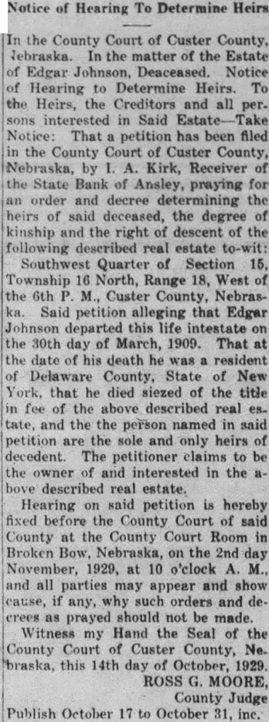 Notice of Hearing To Determine Heirs In the County Court of Custer County, Jebraska. In the matter of the Estate of Edgar Johnson, Deaceased. Notice of Hearing to Determine Heirs. To the Heirs, the Creditors and all persons interested in Said Estate-Take Notice: That a petition has been filed in the County Court of Custer County, Nebraska, by I. A. Kirk, Receiver of the State Bank of Ansley, praying for an order and decree determining the heirs of said deceased, the degree of kinship and the right of descent of the following described real estate to-wit: Southwest Quarter of Section 15, Township 16 North, Range 18, West of the 6th P. M., Custer County, Nebraska. Said petition alleging that Edgar Johnson departed this life intestate on the 30th day of March, 1909. That at the date of his death he was a resident of Delaware County, State of New York, that he died siezed of the title in fee of the above described real es. tate, and the the person named in said petition are the sole and only heirs of decedent. The petitioner claims to be the owner of and interested in the above described real estate. Hearing on said petition is hereby fixed before the County Court of said County at the County Court Room in Broken Bow, Nebraska, on the 2nd day November, 1929, at 10 o'clock A. M., and all parties may appear and show cause, if any, why such orders and decrees as prayed should not be made. Witness my Hand the Seal of the County Court of Custer County, Ne. braska, this 14th day of October, 1929. ROSS G. MOORE, County Judge Publish October 17 to October 31, inc.