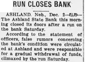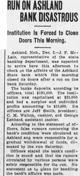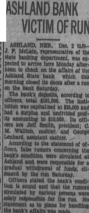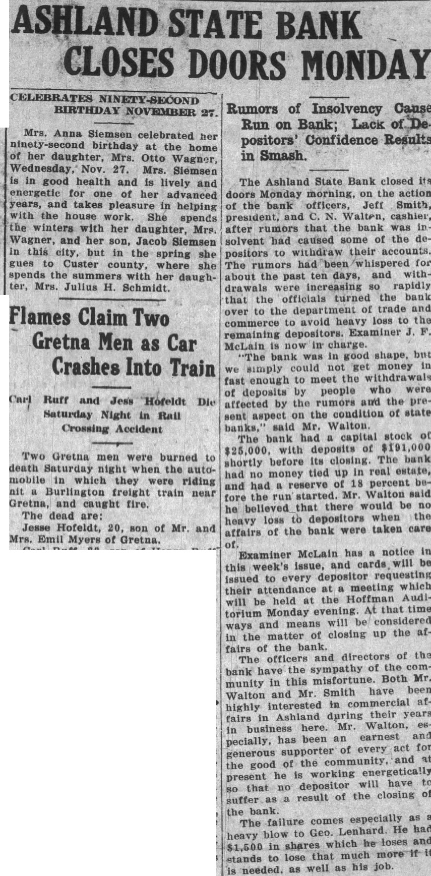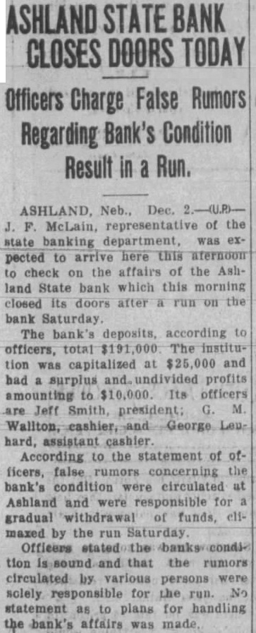Cleaning Up the Banks. The banking situation in the state is of to everybody. to note that the American State bank of Kearney has been reorganized and reopened under new name. Three comparatively small state banks closed by the state department last week, one at Chadron, one at Ashton and the First State bank of Lincoln. The Lincoln bank had moved in from one of the suburbs and had not been able to get on its feet. The Ashland State bank was closed Monday by its officers result of run. The bank had no real estate and was apparently sound condition but many people withdrew their money that the bank doors had to be closed.