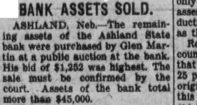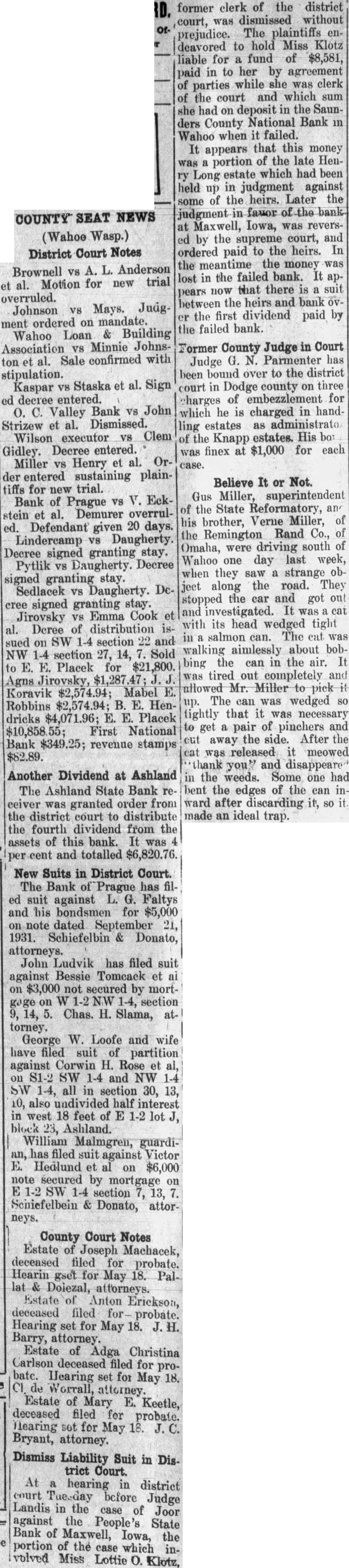 Dismiss Liability Suit in District Court. At a hearing in district court Tuesday before Judge Landis in the case of Joor against the People's State Bank of Maxwell, Iowa, the portion of the case which involved Miss Lottie O. Klotz, former clerk of the district court, was dismissed without prejudice. The plaintiffs endeavored to hold Miss Klotz liable for a fund of $8,581, paid in to her by agreement of parties while she was clerk of the court and which sum she had on deposit in the Saunders County National Bank in Wahoo when it failed. It appears that this money was a portion of the late Henry Long estate which had been held up in judgment against some of the heirs. Later the judgment in favor of the bank at Maxwell, Iowa, was reversed by the supreme court, and ordered paid to the heirs. In the meantime the money was lost in the failed bank. It appears now that there is a suit between the heirs and bank over the first dividend paid by the failed bank.