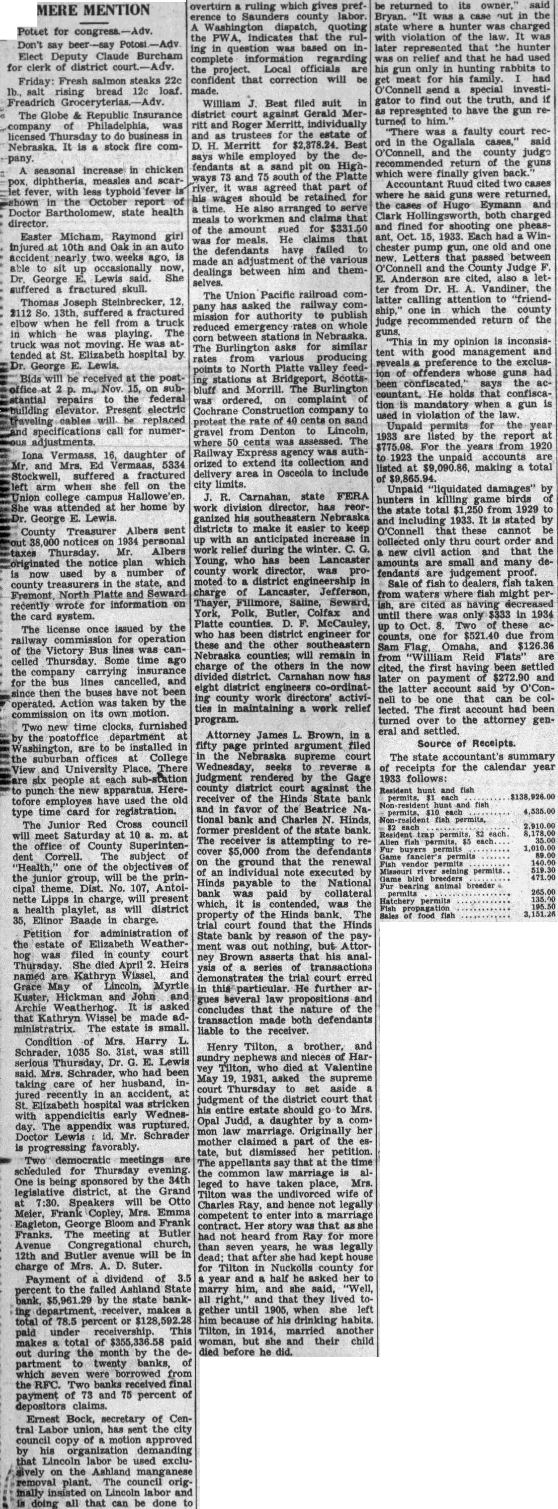 MERE MENTION Pottet for Don't say Elect Deputy Claude Burcham for clerk of district Friday: Fresh salmon steaks 22c rising bread 12c loaf. Freadrich Groceryterias.-Adv. The Globe & Republic Insurance company of Philadelphia, was licensed Thursday to do business in Nebraska. It is a stock fire company. seasonal increase in chicken pox, diphtheria, measles scarlet fever, with less typhoid fever October report Doctor Bartholomew, state health director. Easter Micham, Raymond girl injured at 10th and Oak in auto accident nearly two weeks ago, able to sit occasionally now, Dr. George Lewis She suffered fractured skull. Thomas Joseph Steinbrecker, 12, 2112 So 13th, fractured elbow when he fell from truck in which he was playing. The truck was not moving. He was attended at St. Elizabeth hospital by Dr. George E. will be received at the postoffice at p. m., Nov. 15, on substantial repairs the federal building elevator. Present electric traveling cables will. be replaced specifications call for numeradjustments. Iona Vermass, 16, daughter of Mr. and Mrs. Ed 5334 Stockwell, suffered fractured left arm she fell on the Union college Hallowe'en She was at her home by Dr. George E. Lewis. County Treasurer Albers sent 38,000 notices on 1934 personal taxes Thursday Mr. Albers originated the notice plan which is used by number of county in the state, and Fremont North Platte and Seward recently wrote for information on The license once issued by the for of the Victory Bus lines was cancelled Thursday Some time ago the carrying for the bus lines cancelled, and since then the buses have been operated. Action was taken by the on its own motion. Two new time clocks, furnished by the postoffice department Washington, are to be installed in the suburban offices at College View and University Place. There six people at each station to punch the new apparatus. Heretofore used the old type time card for registration. The Junior Red Cross council will meet Saturday 10 a. m. at the office of County Superintendent Correll. The subject of "Health," one of the objectives of the junior group, will be the principal theme. Dist. No. 107, Antoinette Lipps in charge, will present health playlet, as will district 35, Elinor Baade in charge. Petition for of the estate of Elizabeth Weatherhog filed in county court Thursday. She died April Heirs named Kathryn Wissel, and Grace May of Lincoln, Myrtle Kuster, Hickman and John and Archie Weatherhog. It is asked that Kathryn Wissel be made administratrix. The estate is small. Condition of Mrs. Harry L. Schrader, 1035 So. 31st, was still serious Thursday, Dr. G. E. Lewis said. Mrs. who had been taking care of her husband, inrecently in an accident, at jured St. Elizabeth hospital was stricken with appendicitis early Wednesday. The appendix was ruptured. Doctor Lewis id. Mr. Schrader is progressing favorably. Two meetings are scheduled for Thursday evening. One is being sponsored by the 34th legislative district, at the Grand Speakers will be Otto Meier, Frank Copley, Mrs. Emma Eagleton, and Frank Franks. The meeting at Butler Avenue Congregational church, 12th and Butler avenue will be in charge of Mrs. A. D. Suter. Payment of a dividend of 3.5 percent the failed Ashland State bank, $5,961.29 by the state banking department, makes total of 78.5 percent or 28 paid under receivership. This makes total of $355,336.58 paid out during the month by the department to twenty banks, of which were borrowed from the RFC. received final payment of 73 and 75 percent of depositors claims. Ernest Bock, secretary of Central Labor union, has sent the city council copy of motion approved by organization demanding that Lincoln labor be used exclusively on the manganese removal plant. The council originally and is doing all that can be done to overturn ruling which gives preference to county labor. A Washington dispatch, quoting the PWA, indicates that the ruling in based on incomplete information regarding the project. Local officials are confident that correction will be made. William J. Best filed suit in district court against Gerald Merritt and Roger Merritt, individually and trustees for the estate D. H. Merritt for Best says while employed by the defendants at sand pit on Highways 73 and 75 south the Platte river, it was agreed that part his should be for time. He also to meals to and that of the amount sued for $331.50 was for meals. He claims that the defendants have failed made an adjustment the various dealings between him and themselves. The Union Pacific railroad company has the railway mission for authority to publish reduced emergency on whole corn between Nebraska. The Burlington asks for similar rates from various producing points to North Platte valley feeding at Bridgeport, Scottsbluff and Morrill. The Burlington complaint Cochrane company protest the rate of 40 cents on sand gravel from Denton Lincoln, where 50 cents was assessed. The Railway Express agency was authorized to extend its collection and delivery area in Osceola to include city limits. J. R. Carnahan, state FERA work director, reorganized his southeastern Nebraska districts make it easier to keep up with an anticipated increase work relief during the winter. C. Young, who has been Lancaster county work director, promoted to district in charge of Lancaster, Jefferson, Thayer, Fillmore, Saline, Seward, York, Polk, Butler, Colfax Platte counties. D. F. McCauley, who has been district engineer for these and the other southeastern Nebraska counties; will remain in charge of the others in the now divided district. Carnahan now has eight district engineers co-ordinating county work directors' activities in maintaining a work relief program. Attorney James L. Brown, in fifty page printed argument filed the supreme court Wednesday, seeks reverse judgment rendered by the Gage county district court against the receiver of the Hinds State bank and in favor of the Beatrice National bank and Charles N. Hinds, former president of th