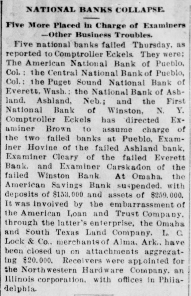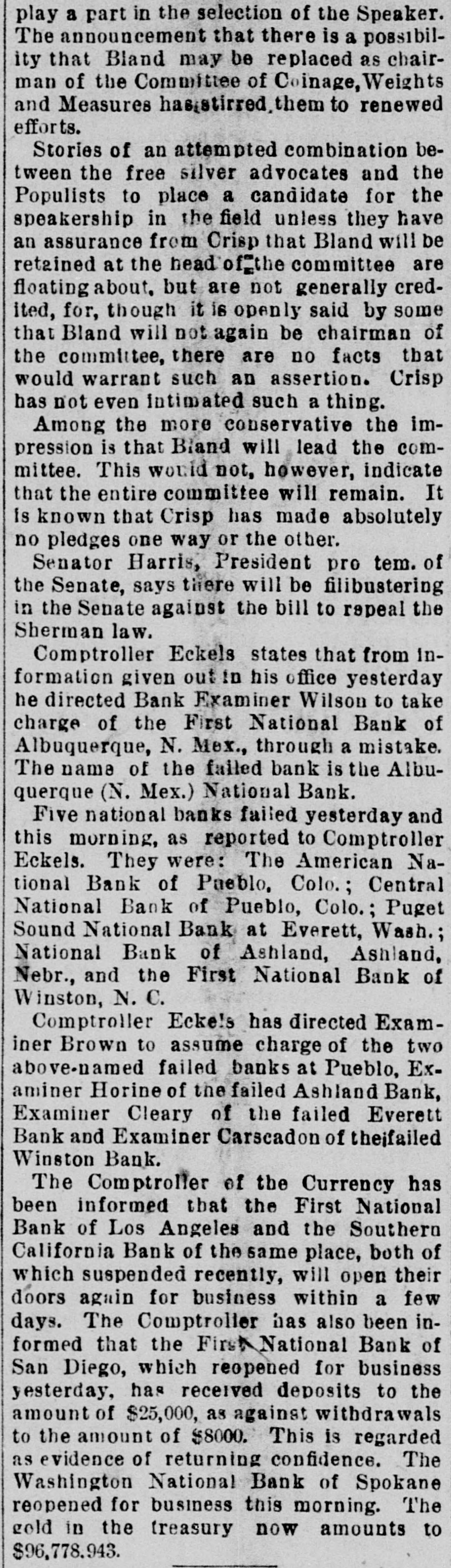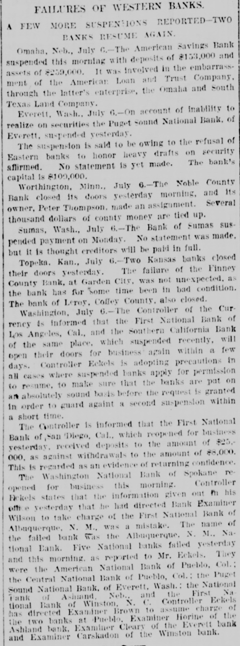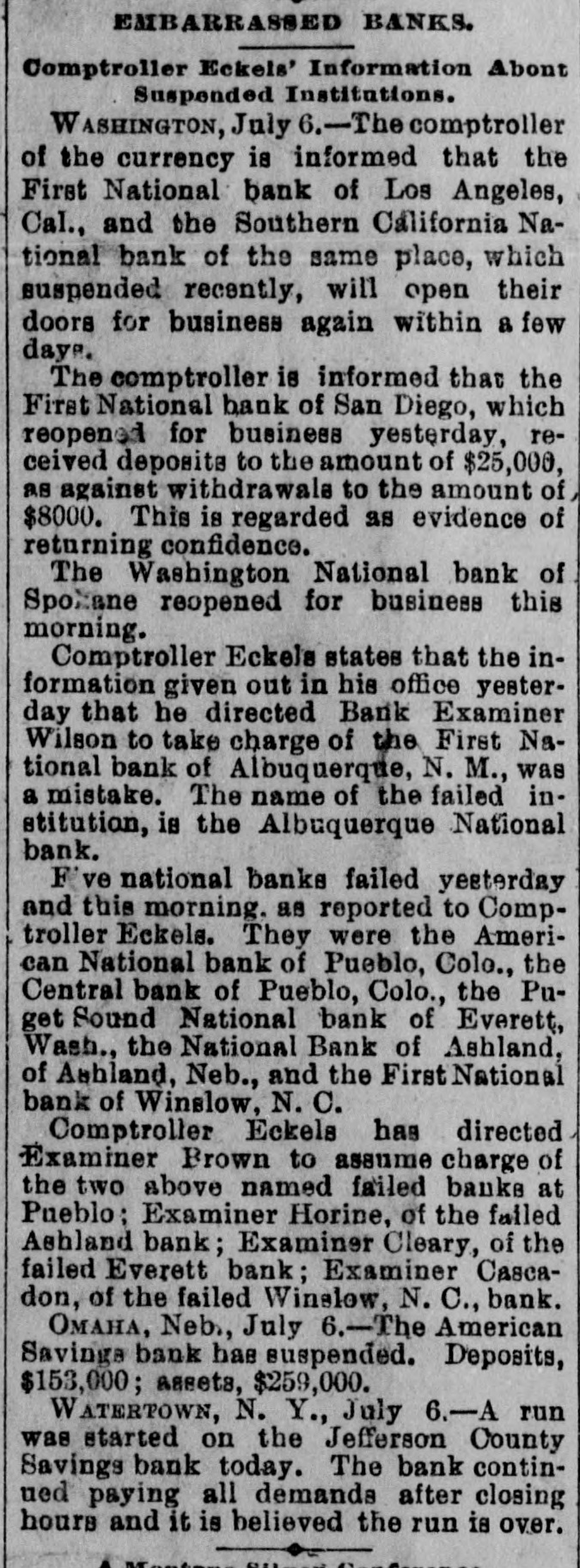 BANKS. Comptroller Eckels' Information Abont Suspended Institutions. WASHINGTON, July 6.-The comptroller of the currency is informed that the First National bank of Los Angeles, Cal., and the Southern California National bank of the same place, which suspended recently, will open their doors for business again within 8 few days. The comptroller is informed that the First National bank of San Diego, which reopened for business yesterday, received deposits to the amount of $25,000, as against withdrawals to the amount of $8000. This is regarded as evidence of returning confidence. The Washington National bank of Spoliane reopened for business this morning. Comptroller Eckels states that the information given out in his office yesterday that he directed Bank Examiner Wilson to take charge of the First National bank of Albuquerque, N. M., was a mistake. The name of the failed institution, is the Albuquerque National bank. F ve national banks failed yesterday and this morning. as reported to Comptroller Eckels. They were the American National bank of Pueblo, Colo., the Central bank of Pueblo, Colo., the Puget Sound National bank of Everett, Wash., the National Bank of Ashland, of Ashland, Neb., and the First National bank of Winslow, N. C. Comptroller Eckels has directed Examiner Brown to assume charge of the two above named failed banks at Pueblo: Examiner Horine, of the failed Ashland bank; Examiner Cleary, of the failed Everett bank; Examiner Cascadon, of the failed Winslow, N. C., bank. OMAHA, Neb., July 6.-The American Savinga bank has suspended. Deposits, $153,000; assets, $259,000. WATERTOWN, N. Y., July 6.-A run was started on the Jefferson County Savings bank today. The bank continued paying all demanda after closing hours and it is believed the run is over.