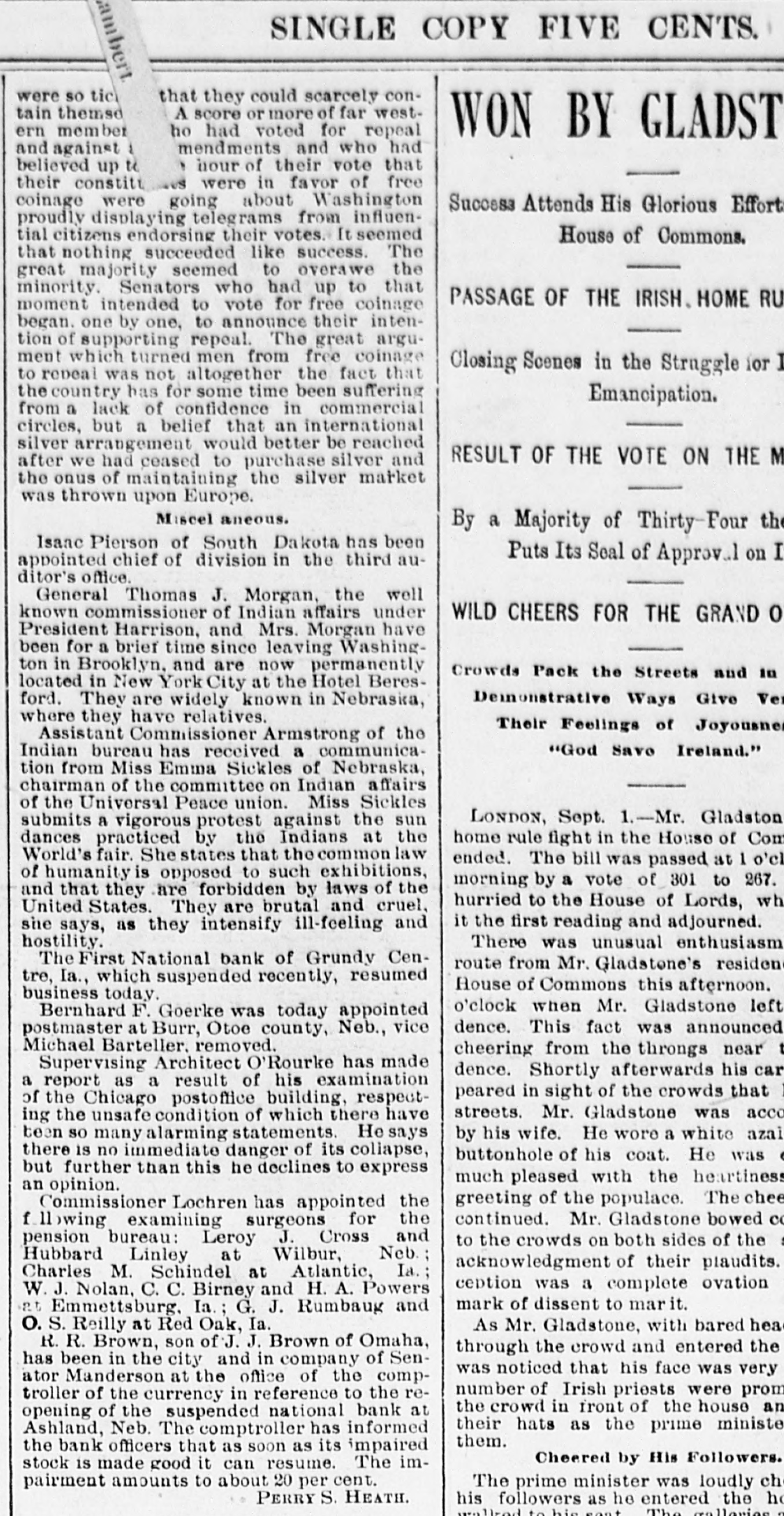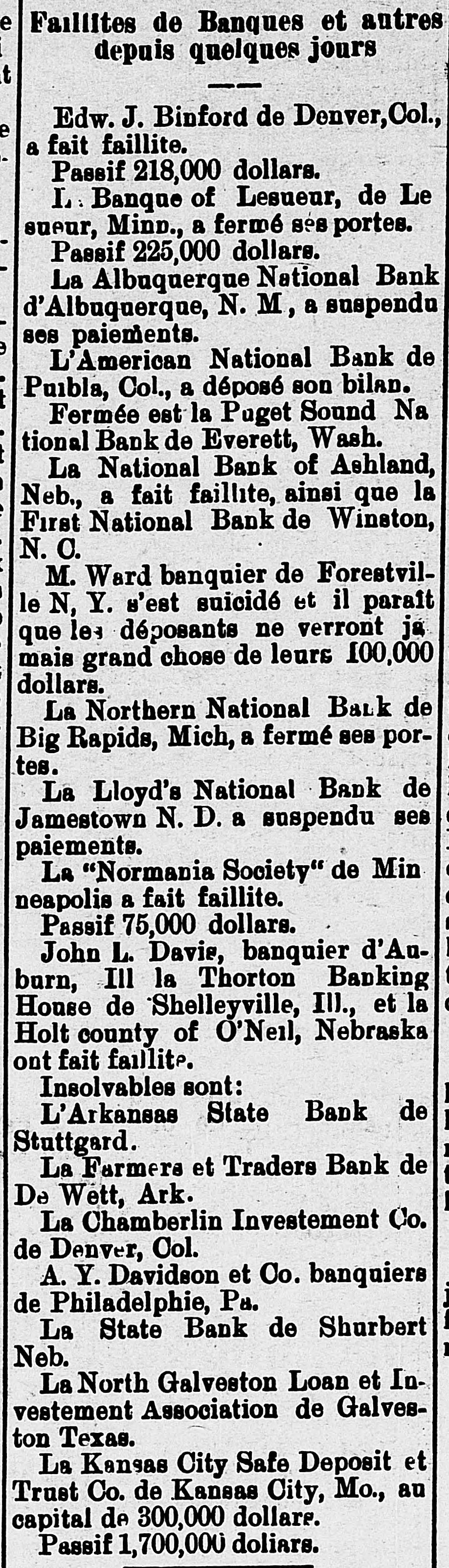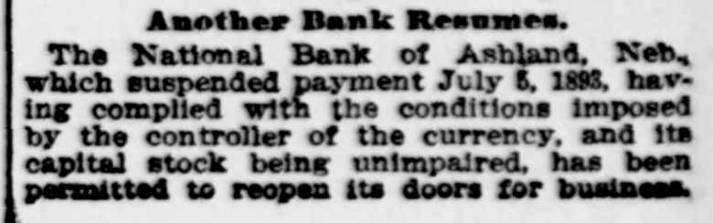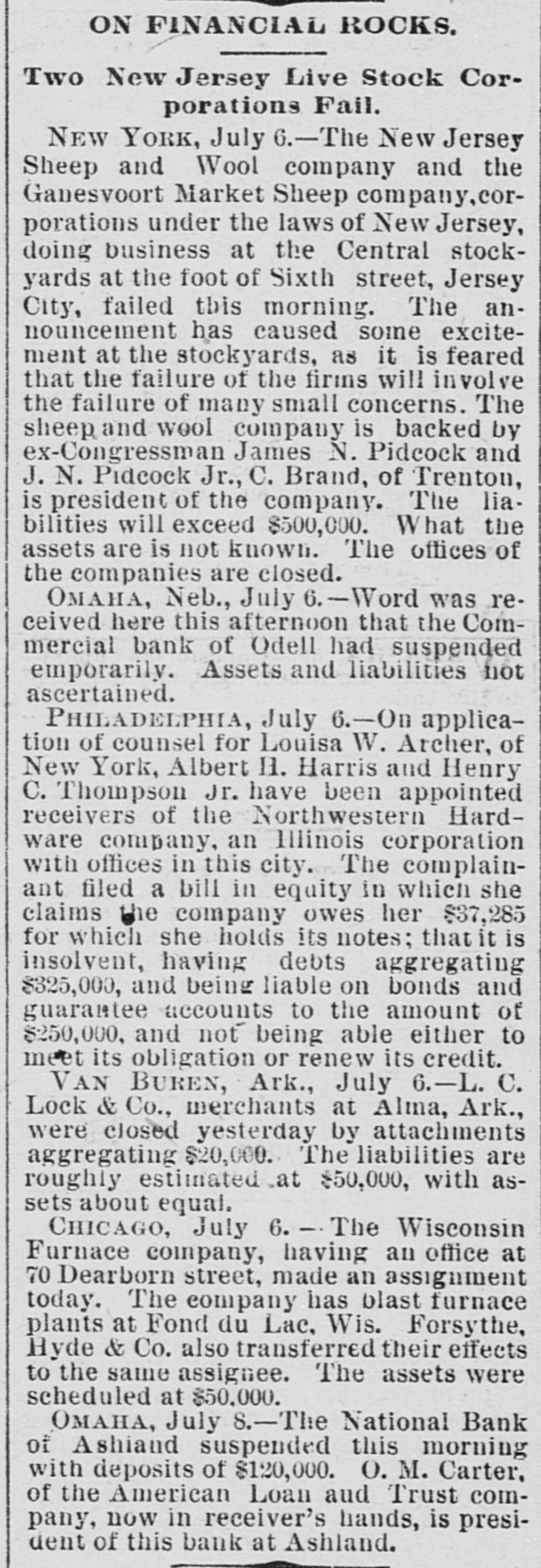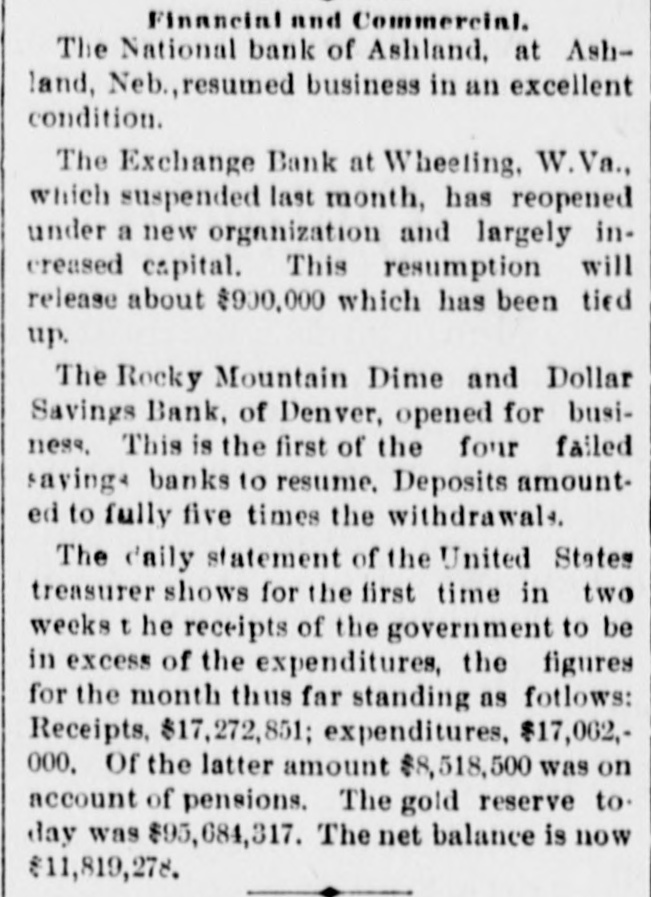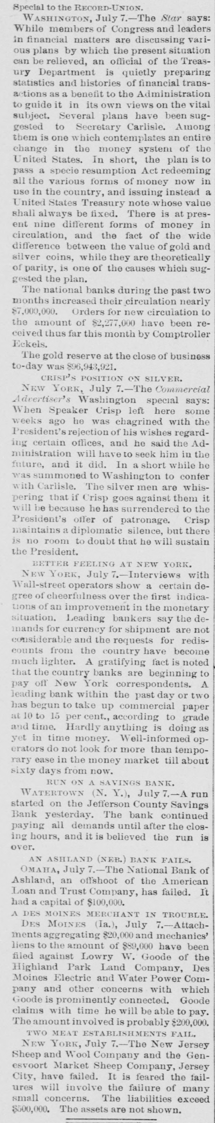 BANKS. Comptroller Eckels' Information Abont Suspended Institutions. WASHINGTON, July 6.-The comptroller of the currency is informed that the First National bank of Los Angeles, Cal., and the Southern California National bank of the same place, which suspended recently, will open their doors for business again within 8 few days. The comptroller is informed that the First National bank of San Diego, which reopened for business yesterday, received deposits to the amount of $25,000, as against withdrawals to the amount of $8000. This is regarded as evidence of returning confidence. The Washington National bank of Spoliane reopened for business this morning. Comptroller Eckels states that the information given out in his office yesterday that he directed Bank Examiner Wilson to take charge of the First National bank of Albuquerque, N. M., was a mistake. The name of the failed institution, is the Albuquerque National bank. F ve national banks failed yesterday and this morning. as reported to Comptroller Eckels. They were the American National bank of Pueblo, Colo., the Central bank of Pueblo, Colo., the Puget Sound National bank of Everett, Wash., the National Bank of Ashland, of Ashland, Neb., and the First National bank of Winslow, N. C. Comptroller Eckels has directed Examiner Brown to assume charge of the two above named failed banks at Pueblo: Examiner Horine, of the failed Ashland bank; Examiner Cleary, of the failed Everett bank; Examiner Cascadon, of the failed Winslow, N. C., bank. OMAHA, Neb., July 6.-The American Savinga bank has suspended. Deposits, $153,000; assets, $259,000. WATERTOWN, N. Y., July 6.-A run was started on the Jefferson County Savings bank today. The bank continued paying all demanda after closing hours and it is believed the run is over.