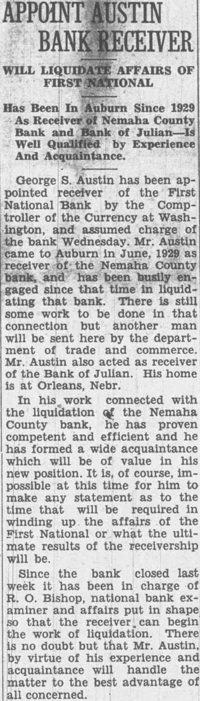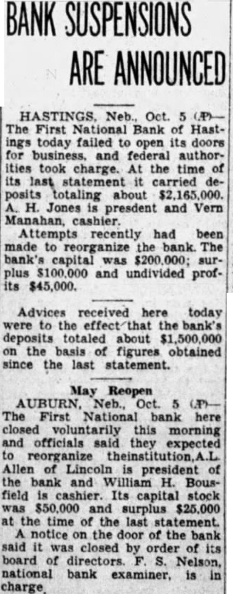 South Sioux City, and his bondsman, the Fidelity Deposit company, told the court Friday that the district court rightfully held they were not liable money lost the failure of bank of Sioux City, since the law says that treasurer must deposit public money in bank, and that while this bank was never designated depository, the city had its the council knew the use being of Wescott, farmer, three or south of Lincoln, and Frederick E. Keons, 1420 Rose, were in an mile north the Denton road on the road ning. Neither was badly hurt but both were tken Bailey's rium by Deputy Sheriff Davis and given The cars damaged. Deputy Davis said that escott admitted he was driving without lights. Secretary Porterfield of the ernor's office has notified dential electors meet at the governor's office Wednesday, cast their vote for president vice provision of the federal statute. The electors James Lawrence, Lincoln; Harvey Newbranch, Effie M Byers, Hastings: James Quig. ley, William Cowan, Stanton; Frank M. Colfer, Mc Cook: Mary E. Farrell, Schuyler. Allen, close friend, adviser and Governor Bryan, said the governor had been making steady recovery but it still problematical whether he would be able to face the legislature in person early month. Allen the governor's had improved so that was fairly cetrain he be prepare his messages the but that time would decide whether he could read them personally. The governor still is being kept in bed. Petition for probate of the will John sr., who died filed court. His will left his estate to his wife, for her lifetime and then goes to his two grandCatherine Ellen Finigan, and Paul. proviso that of the land should be sold until 1940. The will states that John Finigan, son of the deceased, was not given any part of the estate provision had previously been made for him and his two children were remembered substantially. Mack West, 229 No. 11th, notified police Friday that he ing the car which was crushed by Burlington train at the Havelock avenue crossing Thursday morning. He he was driving toward Havelock and did not see the train until was too late to stop. He tried to get across the tracks ahead of the train, but failed, the pilot of the engine hitting the rear of the car. West lost one tooth but his companion, whose name he did not know, was uninjured. Box Butte county taxes for all this year will than the taxes of last year, according to report by County Clerk W. Irish to the state tax all local taxes is and in state taxes is $2,649.55. The total assessed valuation of the county was reduced $3,220,125. State taxes are cut from $36,104 to $33,-