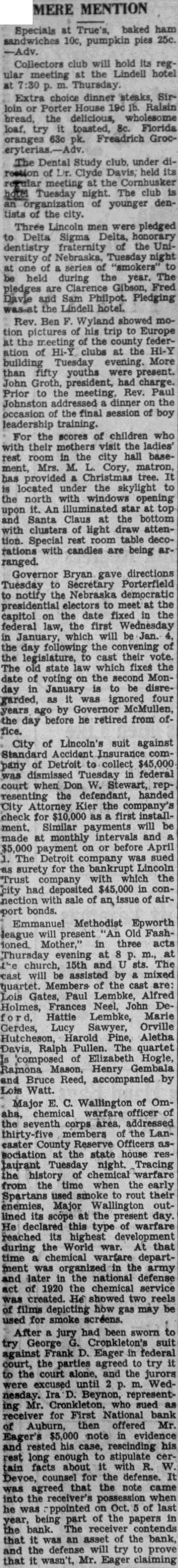 MERE MENTION trees, fresh certified trees: all sizes; will not shed. 1526 Rabbi Ogle B'Nai Jeshurun, Twentieth and South, speak on Uses of Adversity" at the regular Friday evening services at m., Friday. George Burt says that another carload Dr. Phillip's treeFlorida arrive Thurs. morning. They are the best oranges for juice on the market. at all Mrs. Effie M. Byers, democratic from Hastings, address Saturday noon at the Cornhusker "Duties of Elected States Officers." 100 regular Dutch lunch sell at 95c each. man's gift. Contains six portions Swiss two jars caviar, jar assorted anchovies, box of ham:mered wafers, 95c. Beachly Bros. Deputy Fire Marshal Butcher tion of the cause of the fire at the Fair store in Beatrice as soon the weather warms up enough the building. He found no reason to believe the fire was malicious. Suit of George S. Austin, receiver for First National bank Auburn, Maurice set for trial Friday in fedTeral court, has been continued. Trial by jury was waived and the jurors all excused, subject to The Ward suit was for lection on $2,200 note. Henry Dietz, seventeen, days ago pleaded guilty to forging check, was paroled by District Judge Chappell until 1935, when Dietz will twenty-one. Judge Chappell said that account the boy's age he was paroling him. The boy has been instated in high school, where he has but semester to complete his gradation. Sergeant McDowell went to Omaha Friday morning to return Sylvester Mason, who wanted here for questioning in connection the robbery, sometime shortly before Sept. of the home of his brother, Dr. Floyd Mason, 706 So. 32nd. Approximately $325 worth of clothing and other artiwere taken in robbery. Some of the loot was recovered.