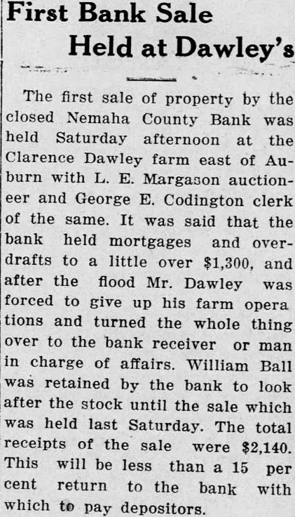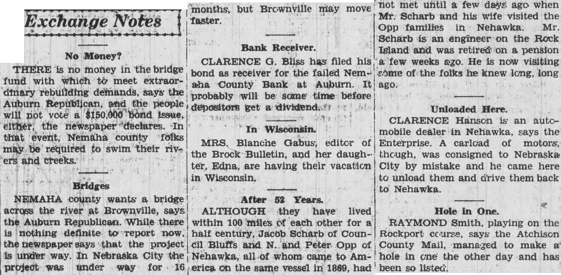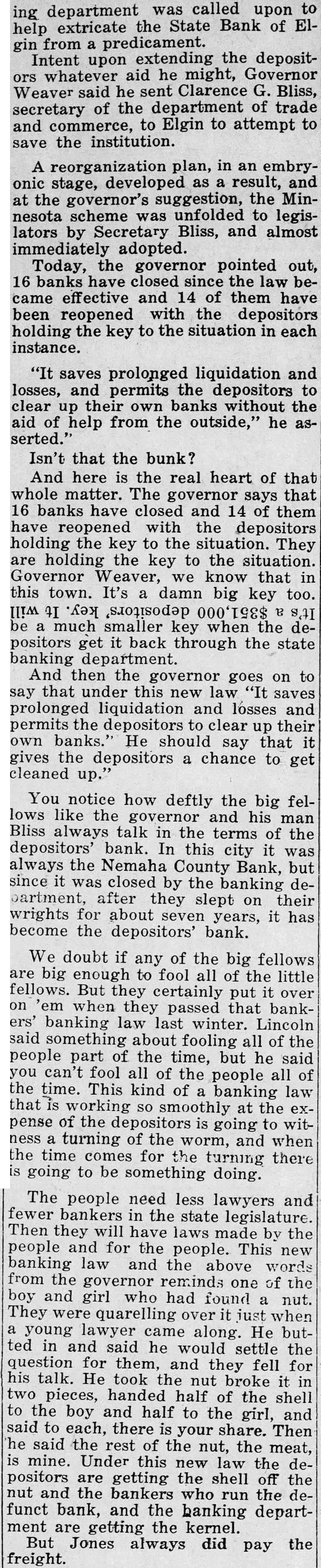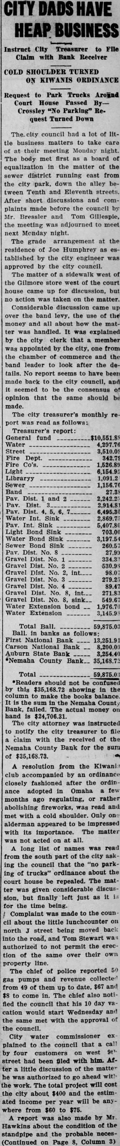 Total *Readers should showing the column make the books the Nemaha County Bank, failed. The actual money on hand The city attorney was instructed notify the city treasurer to claim with the received of the Nemaha County Bank for the sum of $35,168.73. resolution from the accompanied by an ordinance closely fashioned after the ordinadopted in Omaha few months regulating, or rather ago abolishing fireworks, read and met with cold shoulder Only one alderman appeared to be impressed with its importance. The matter not acted all. long list names was read from the south part of the ing the council that the "no parking of trucks" ordinance about the court house be repealed. The matwas given considerable discussion, but finally just for the time being. Complaint was made to the about the little lunchcounter north street being moved back the road, and Tom Stewart authorized to not permit the the same over their property line. chief of reported 50 The police pumps and revenue collected from of them to date, $67 come in. The chief also notified the council that his day would start Wednesday and cation the with the approval of same met council. City water commissioner to the council that call plained four customers on west street had been filed with him. little discussion the matter authorized ahead with go work. The total project will cost the $400 and the estimcity ated income will be per year where from $60 to $75. report was also made by about the condition standpipe and the probable (Continued Page Column