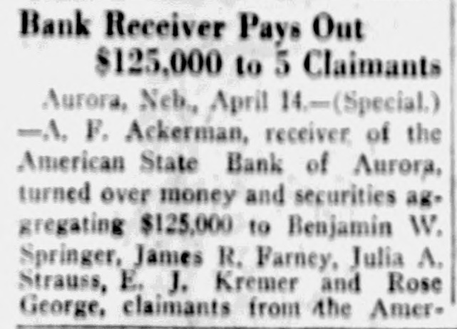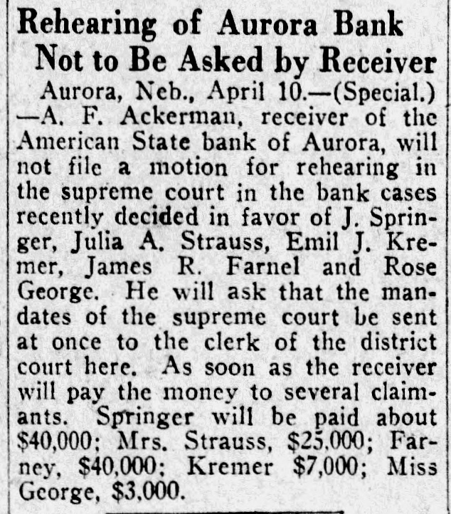 Rehearing of Aurora Bank Not to Be Asked by Receiver Aurora, Neb., April 10.-(Special.) -A. F. Ackerman, receiver of the American State bank of Aurora, will not file a motion for rehearing in the supreme court in the bank cases recently decided in favor of J. Springer, Julia A. Strauss, Emil J. Kremer, James R. Farnel and Rose George. He will ask that the mandates of the supreme court be sent at once to the clerk of the district court here. As soon as the receiver will pay the money to several claimants. Springer will be paid about $40,000; Mrs. Strauss, $25,000; Farney, $40,000; Kremer $7,000; Miss George, $3,000.