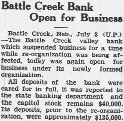 Battle Creek Bank Open for Business Battle Creek, Neb., July Battle Creek valley bank which suspended business for time while was being affected, today was again open for business under its newly formed organization. All deposits of the bank were cared for in full, it was reported to the state banking department and the capitol stock remains $40,000. Its deposits, prior to the zation, were approximately