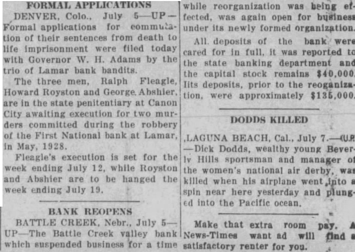 FORMAL Colo., July Formal applications for tion of their from death life imprisonment were filed today with Governor H. Adams by the trio of Lamar bank bandits The three men, Ralph Fleagle, Howard Royston and George Abshier. are in the state penitentiary at Canon reorganization was being fected, again open for business under its newly formed All deposits of the bank cared for in full. was reported state banking department and the capital stock remains Tits deposits, prior to the reoganization, were approximately DODDS KILLED awaiting execution for two murders during the robbery of the First National bank Lamar, LAGUNA BEACH, Cal., July in May, 1928. Dodds, wealthy young BeverFleagle's execution is set for the Hills sportsman and manager week ending July while Royston women's national air derby, and Abshier are to be hanged the killed when his airplane went week ending spin near here yesterday and into the Pacific ocean. BANK REOPENS CREEK, Nebr., July Make that extra room Battle Creek valley bank want ad will find suspended business time satisfactory renter for you.