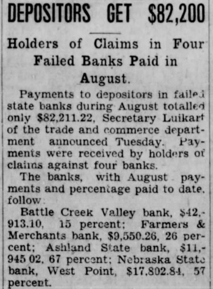 DEPOSITORS GET $82,200 Holders of Claims in Four Failed Banks Paid in August. Payments to depositors in failed state banks during August totalled only $82,211.22 Secretary Luikart of the trade and commerce department announced Tuesday Payments were received by holders claims against four banks. The banks, with August ments and percentage paid to date. follow Battle Creek Valley bank, $42, percent: Farmers Merchants bank, $9,550.26, 26 percent; Ashland State bank, $11,67 State bank, West Point, 57 percent.