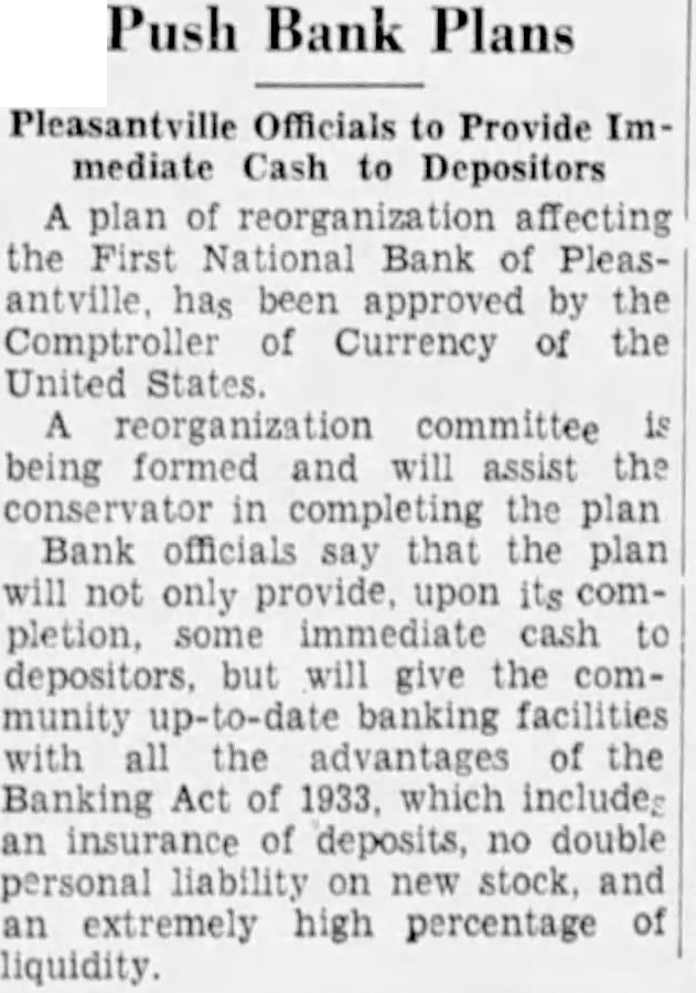 Push Bank Plans Pleasantville Officials Provide mediate Cash Depositors plan reorganization affecting the Bank Pleasbeen approved the Comptroller Currency the United States. reorganization committee being formed assist the conservator completing the plan Bank officials that the plan not provide, upon pletion, immediate cash depositors, the community banking facilities advantages the Banking which includes an insurance of deposits, double personal liability extremely percentage liquidity.