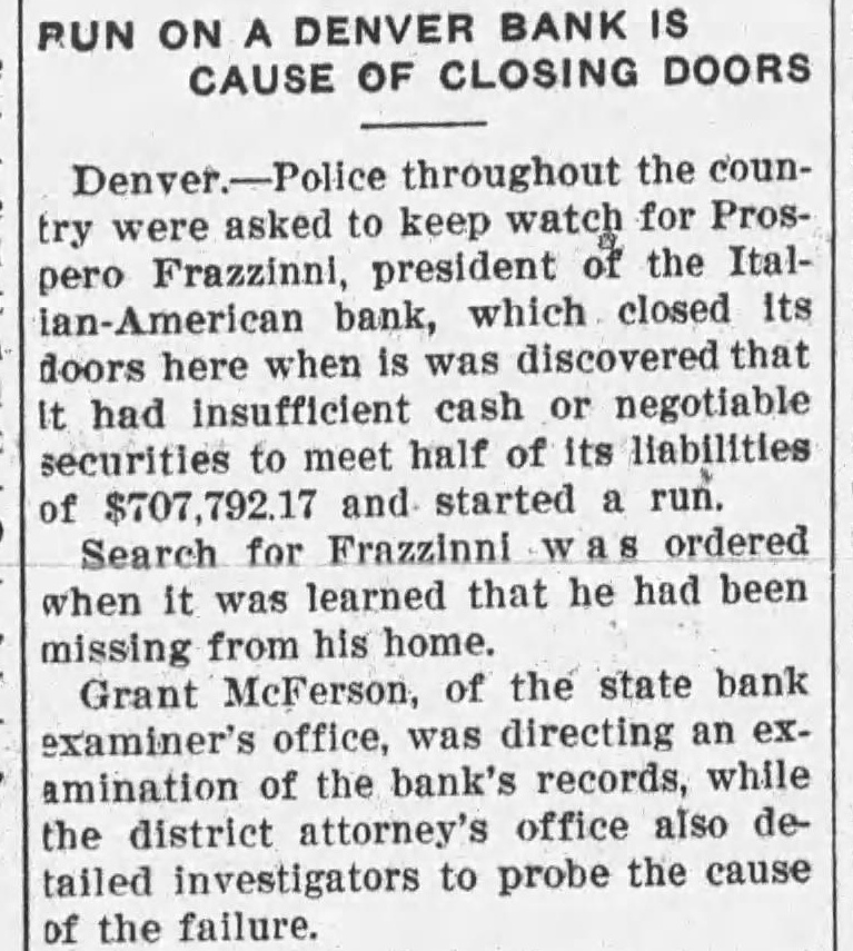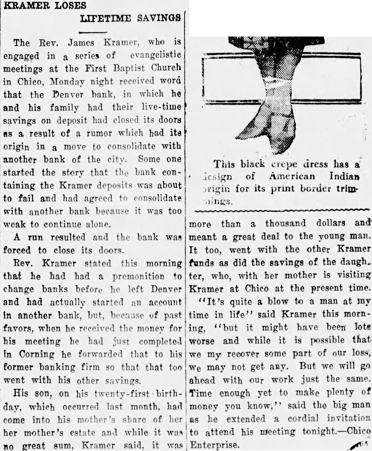 The Rev. James Kramer, who is engaged in a series of evangelistic meetings at the First Baptist Church in Chico, Monday night received word that the Denver bank, in which he and his family had their live-time savings on deposit had closed its doors as a result of a rumor which had its origin in a move to consolidate with another bank of the city. Some one started the story that the bank containing the Kramer deposits was about to fail and had agreed to consolidate with another bank because it was too weak to continue alone. A run resulted and the bank was forced to close its doors. Rev. Kramer stated this morning that he had had a premonition to change banks before he left Denver and had actually started an account In another bank, but. because of past favors, when he received the money for his meeting he had just completed in Corning he forwarded that to his former banking firm so that that too went with his other savings. His son, on his twenty-first birthday, which occurred last month. had come into his mother's share of her her mother's estate and while it was no great sum, Kramer said, it was more than a thousand dollars and meant a great deal to the young man. It too, went with the other Kramer funds as did the savings of the daugh. ter, who, with her mother is visiting Kramer at Chico at the present time. "It's quite a blow to a man at my time in life" said Kramer this morning, "but it might have been loteworse and while it is possible that we my recover some part of our loss, We may not get amy. But we will go ahead with our work just the same. Time enough yet to make plenty of money you know," said the big man as he extended a cordial invitation to attend his meeting tonight.-Chico Enterprise.