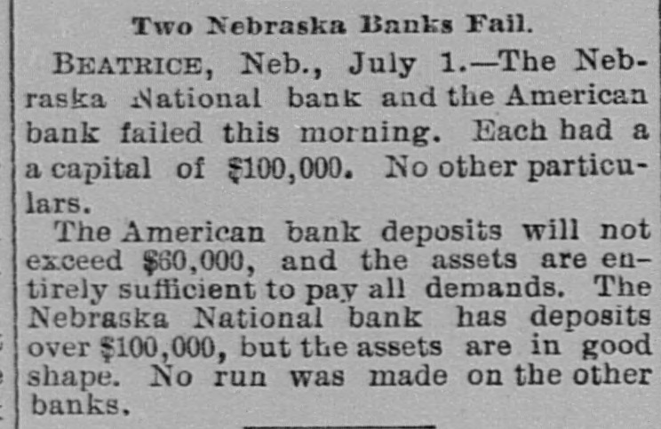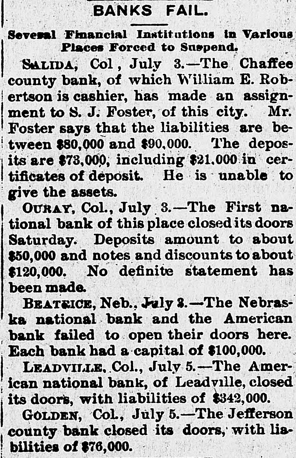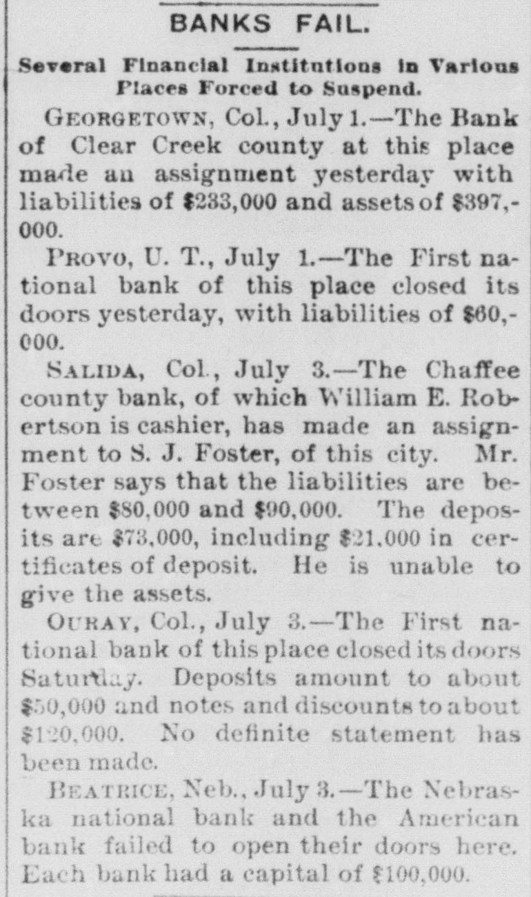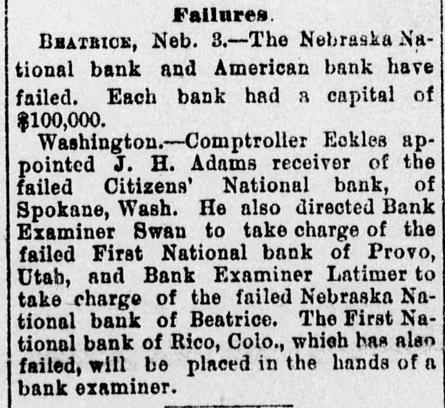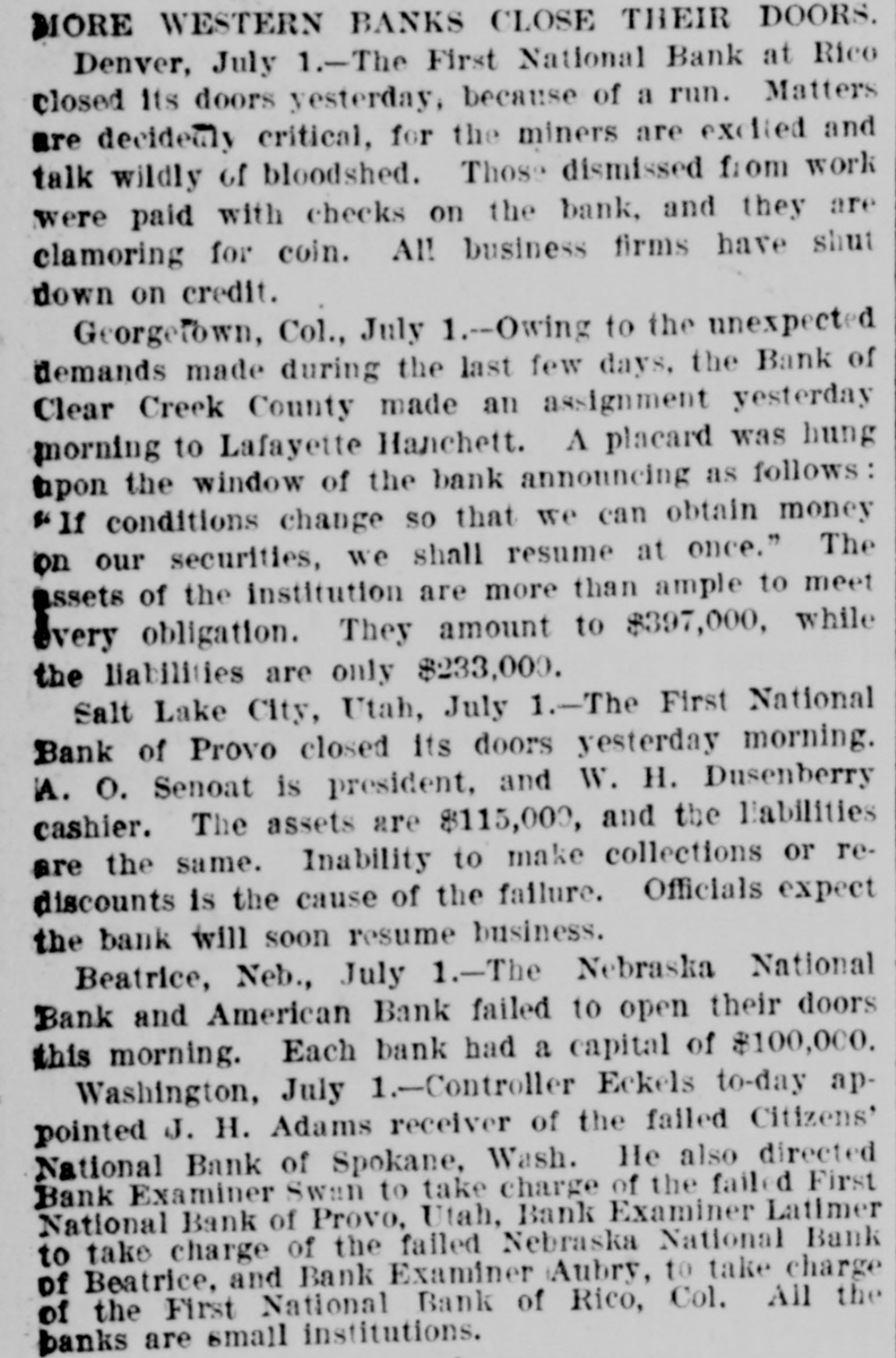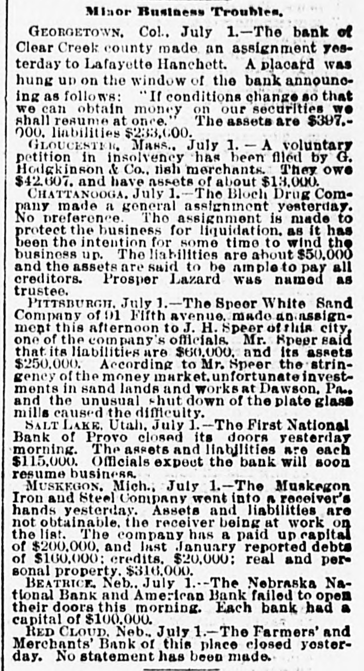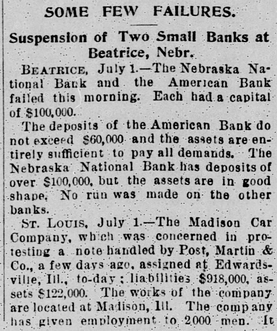 An Immense St. Louis Concern in a Receiver's Hands, ST. LOUIS, July 1.-The Madison Car company filed articles of assignment in the recorder's court at Edwardsville, Ill., today. The assets are given at $918,000 and liabilities at $1,122,000, Paul A. Fusz is named as assignee. The company recently erected a large plant for the manufacture of railway cars at Madison, III., opposite this city, and has endeavored to build up a city similar to Pullman, III. The company has been in straitened circumstances for some time, and the stringency of the money market has precipitated the failure. About 690 were employed at the works. The announcement of the failure created surprise in mercautile circles in this city, owing to the fact that the stockholders of the company are all St. Louis people. Many of the stockholders are also heavily interested in the Merchants' Bridge, the Security Building and other large enterprises. The company is capitalized at $500,000,and about six months ago floated an additional bonded indebtedness of $500,000. This was used in p ying off pressing obligations. The company has done a heavy business in manufacturing railway cars and material, and it is said had some difficulty in securing payment for material and rolling stock furnished to different railroads. OSALT LAKE, Utah, July 1. - The National Bank of Commerce at Provo closed its doors this morning owing to a run caused by the failure of the First National bank yesterday. Assets, $80,000; capital. $50,000; other liabilities, $25,000. FORT WORTH, Tex., July 1.-The Exchange bank at Iowa Park closed its doors yesterday. The liabilities and assets are unknown here, but it is believed that the depositors will be paid in full. A sudden withdrawal of deposits coused the suspension. PHILADELPHIA, July 1.-Executions have been issued from common pleas court on five judgments entered on judgment notes aggregating $44,842.40, against Charies Illingsworth, dealer in morocco. OMAHA, Neb., July 1.-The Nebraska National Bank of Beatrice, capital: $100,000, and the American Bank of Beatrice, a small concern, both closed their doors today. They have been in a weak condition for some time. DENVER, Col., July 1.-The First National Bank of Rico closed its doors yesterday because of a run. Matters are decidedly critical, for the miners are excited and talk wildly of bloodshed. Those dis missed from work were paid with checks on the bank. and they are clamoring for coin. All business firms have shut down on crodit. WASHINGTON, July 1.-Comptroller Eckels today appointed J. R. . Adams receiver for the failed Citizens' National Bank of Spokane. He also directed Bank Examiner Swan to take charge of the failed First National Bank of Provo, Utah, and Bank Examiner Latmer to take charge of the failed Nebraska National Bank, of Beatrice, Neb. Comptroller Eckels was informed this afternoon of the failure of the First National bank of Phillipsburg, Mont. He has directed Bank Examiner Aubry to take charge of the failed National Bank at Ricu, Col.