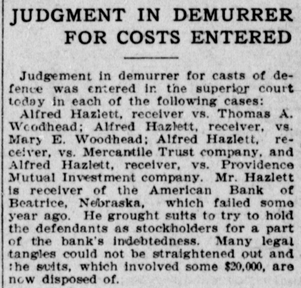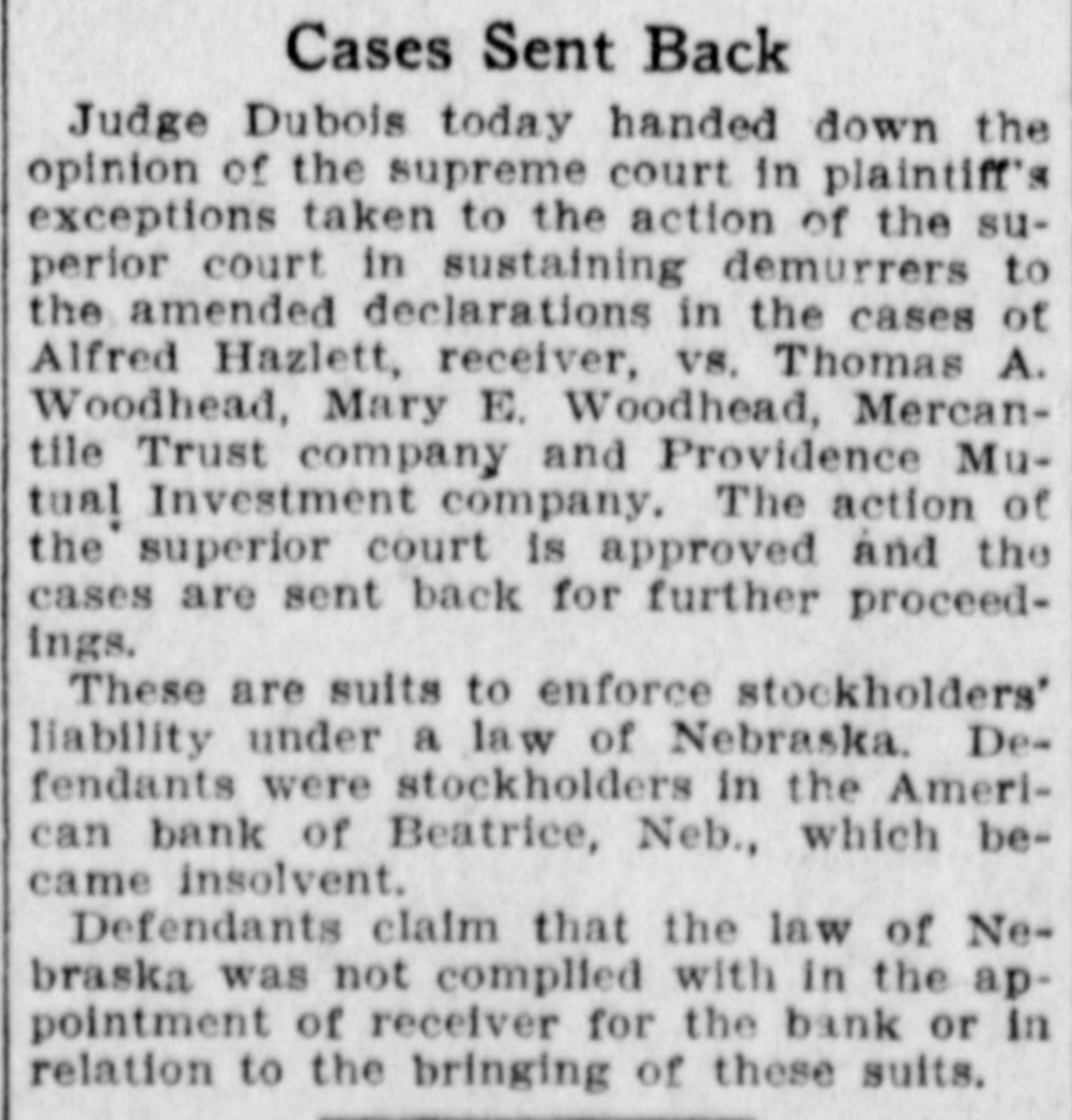 # Cases Sent Back Judge Dubois today handed down the opinion of the supreme court in plaintiff's exceptions taken to the action of the superior court in sustaining demurrers to the amended declarations in the cases of Alfred Hazlett, receiver, vs. Thomas A. Woodhead, Mary E. Woodhead, Mercantile Trust company and Providence Mutual Investment company. The action of the superior court is approved and the cases are sent back for further proceedings. These are suits to enforce stockholders' liability under a law of Nebraska. Defendants were stockholders in the American bank of Beatrice, Neb., which became insolvent. Defendants claim that the law of Nebraska was not complied with in the appointment of receiver for the bank or in relation to the bringing of these suits.
