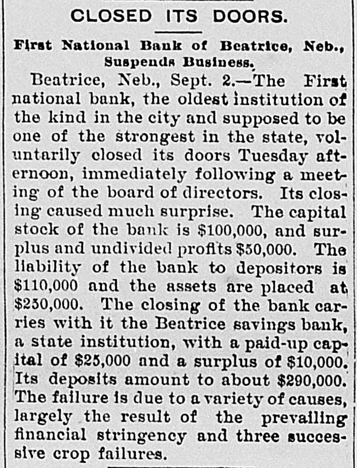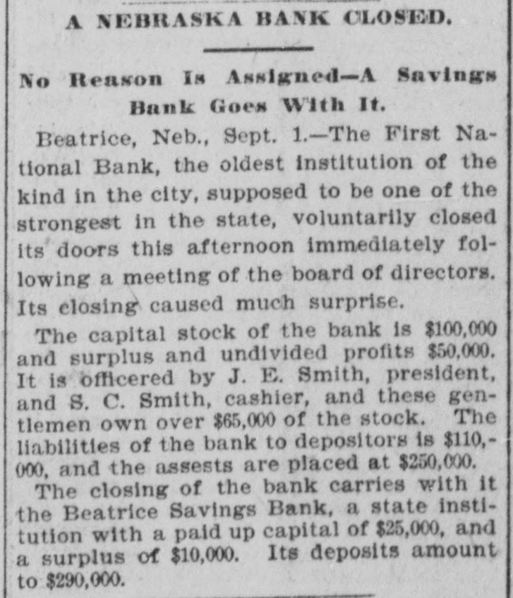 A NEBRASKA BANK CLOSED. No Reason Is Assigned-A Savings Bank Goes With It. Beatrice, Neb., Sept. 1.-The First National Bank, the oldest Institution of the kind in the city, supposed to be one of the strongest in the state, voluntarily closed its doors this afternoon immediately following a meeting of the board of directors. Its closing caused much surprise. The capital stock of the bank is $100,000 and surplus and undivided profits $50,000. It is officered by J. E. Smith, president, and S. C. Smith, cashier, and these gentlemen own over $65,000 of the stock. The liabilities of the bank to depositors is $110,000, and the assests are placed at $250,000. The closing of the bank carries with it the Beatrice Savings Bank, a state institution with a paid up capital of $25,000, and a surplus of $10,000. Its deposits amount to $290,000.